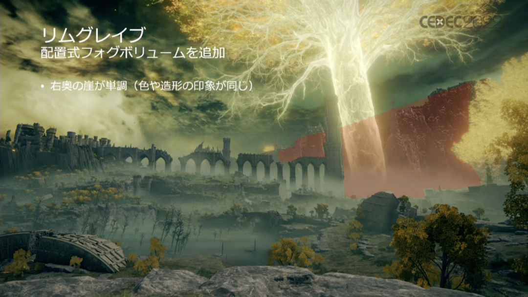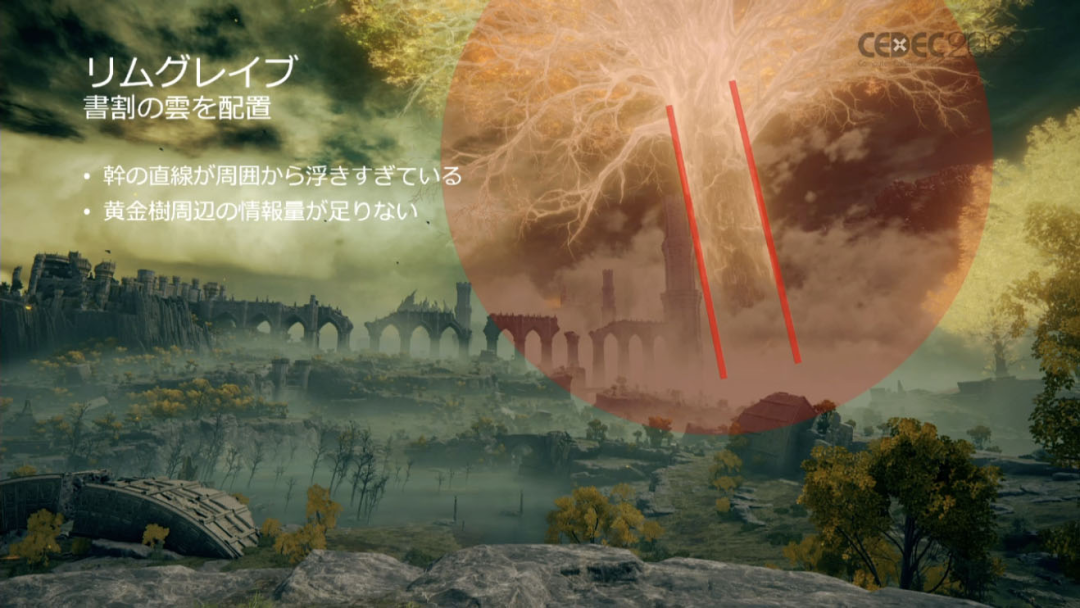 在筛选具体哪儿有问题的时候,首先被指出的地方就是“这是没有特色的风景”。换句话说,这样的场景看起来就跟常见的幻想系场景一样,没办法确立起属于《艾尔登法环》自身的独特美术风格。