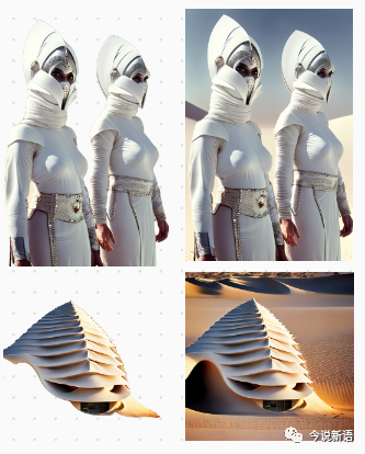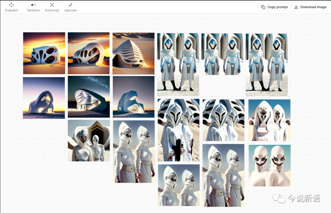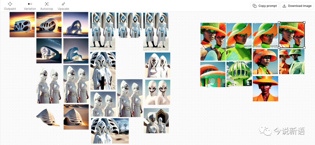 变化Variations你还可以对单张图像选择Variations生成更多同风格的内容。下面看一下目前的画布,所有生成的内容都可以放置在画布上进行调整、比对。