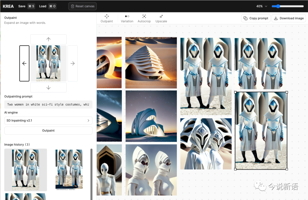前段时间曾经提到目前AIGC领域比较热的是在自训练模型方面,各家第三方平台纷纷推出了自己的自训练模型,模型已经成为第三方的一个竞争力,但第三方平台也都在努力做出差异化服务,用户也在期待除自训练模型之外能有更多的新型服务。近日Krea AI推出了一个新的画布功能,包含了15个自定义的AI模型,以及图像变化(Variations)、外扩(Out painting)、放大(Upscaling)、背景去除等功能。