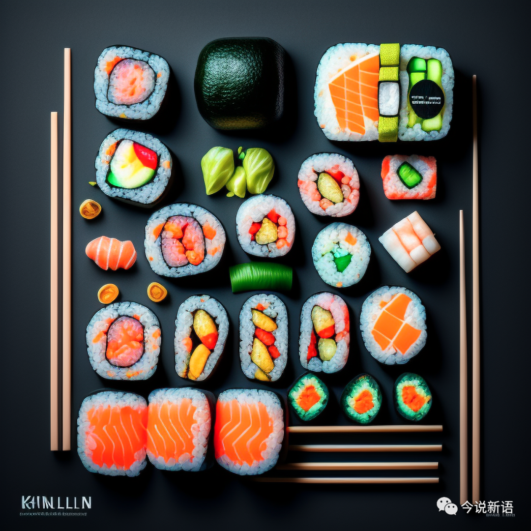 示例提示语:Perfect Sushi knolling :: dark background, studio lighting, low contrast, 8k, food photography, finalist, shot on Phase One, ISO 100