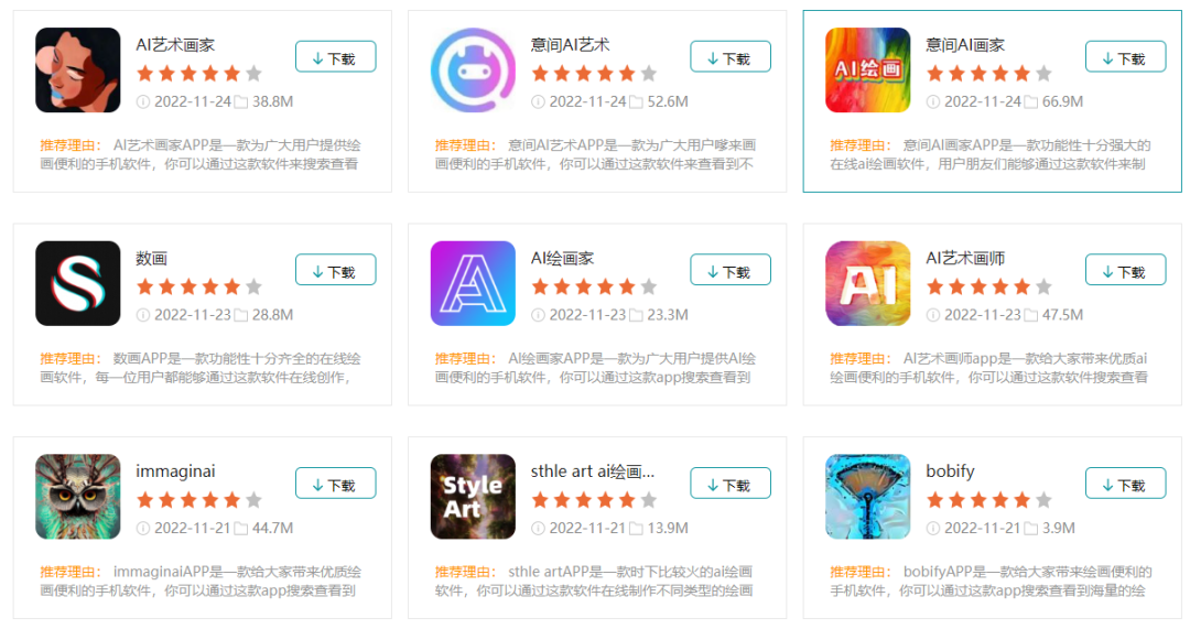 目前,市面上的AI绘图工具越来越多,手机版APP更是如雨后春笋版爆发,比如目前大火的有:意间AI艺术、AI艺术画家、数画、AI绘画家、StyleArtAPP、梦幻AI画家、皮卡智能……,各种手机版APP以及小程序。