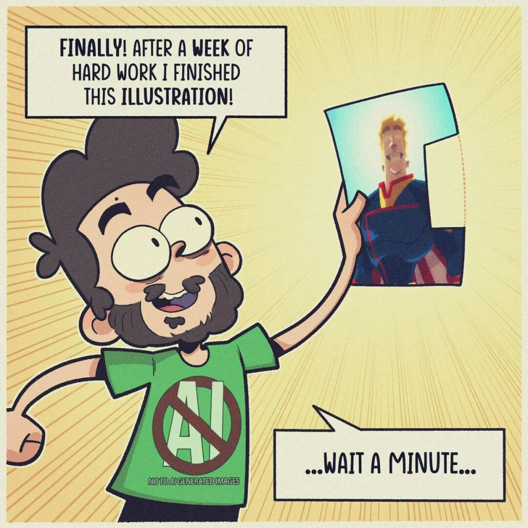 除了转发反AI标识图,各路艺术家和画家纷纷绘制了具讽刺意味的作品,以表态度立场。