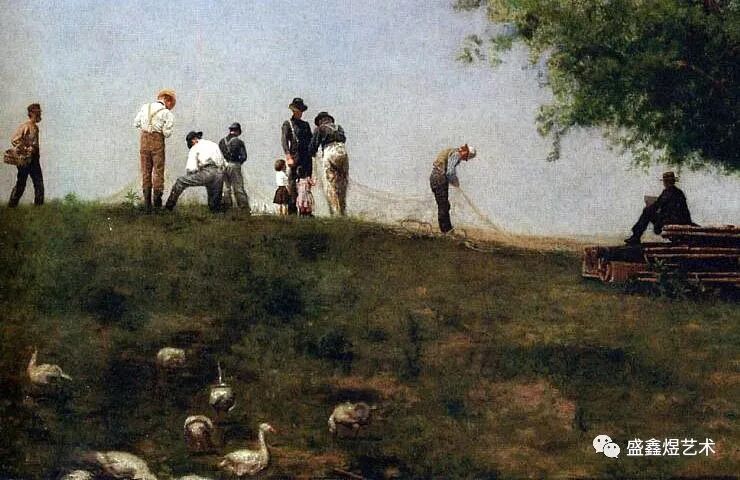 此外,埃金斯创作了许多大型画作,将肖像画带出客厅,走进了他所在城市的办公室、街道、公园、河流、竞技场和外科圆形剧场。这些活跃的户外场所让他能够画出最能激发他灵感的主题:运动中的裸体或轻装人物。在这个过程中,他可以在充足的阳光下塑造身体的形状,并利用他对透视的研究创造出深空的图像。埃金斯对新的动态摄影产生了浓厚的兴趣,他现在被视为该领域的创新者。