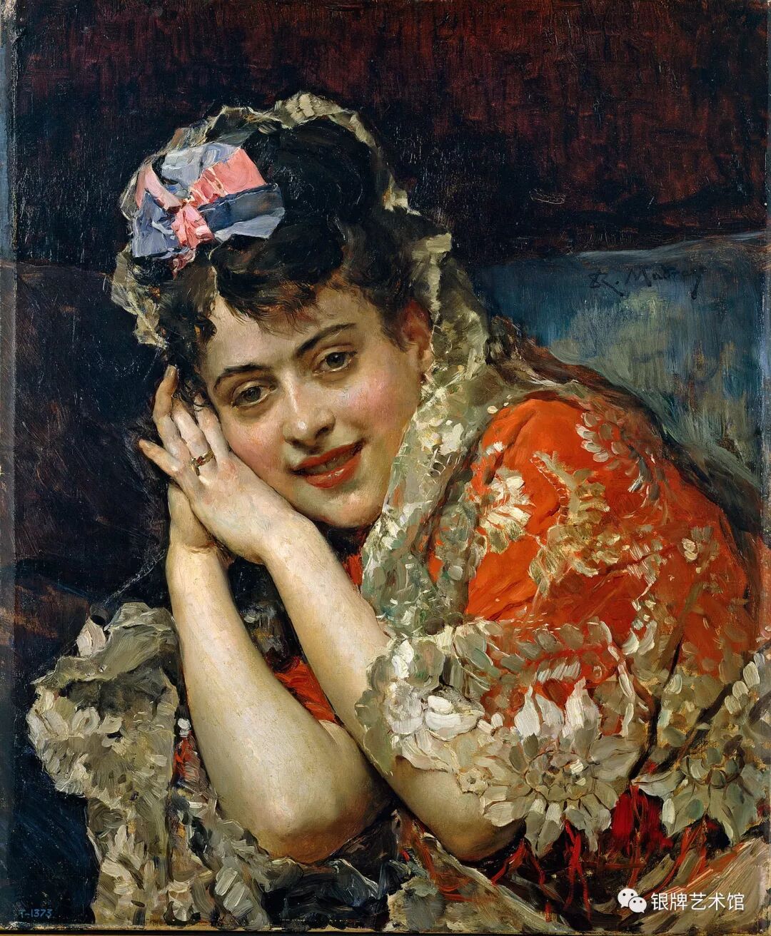 艾琳·马森 大家好!今天给大家介绍西班牙画家加雷特创作于1879年的油画作品《艾琳·马森》,现收藏于马德里普拉多博物馆。 局部图 雷蒙多·德·马德拉索·加雷特,出生于罗马。自幼从其父学画,大多时间生活在巴黎,并在那里的美术学校学习。 局部图 他是位杰出的沙龙风格肖像画画家,他拥有高超的绘画技法,起初主要从事现实主义风格的绘画创作,在他创作晚期的作品中,可以看出他吸收了洛可可风格和日本风格的特质,对绘画进行创新。 局部图 他的大部分女性肖像都使用一位名叫艾琳·马森的模特,她是巴黎卡萨拉侯爵府门房的女儿,这幅作品也不例外。 局部图 这幅肖像画显然是来自写生稿,画家以阔大的笔触,从形象出发,以写实画的熟练技法进行描绘。 局部图 突出展现了女郎的面容与衣饰,红色镶花的外衣,给观者视觉带来强烈的剌激,同时也凸显出女郎热情开朗的性格特质,是一幅不可多得的肖像画精品。