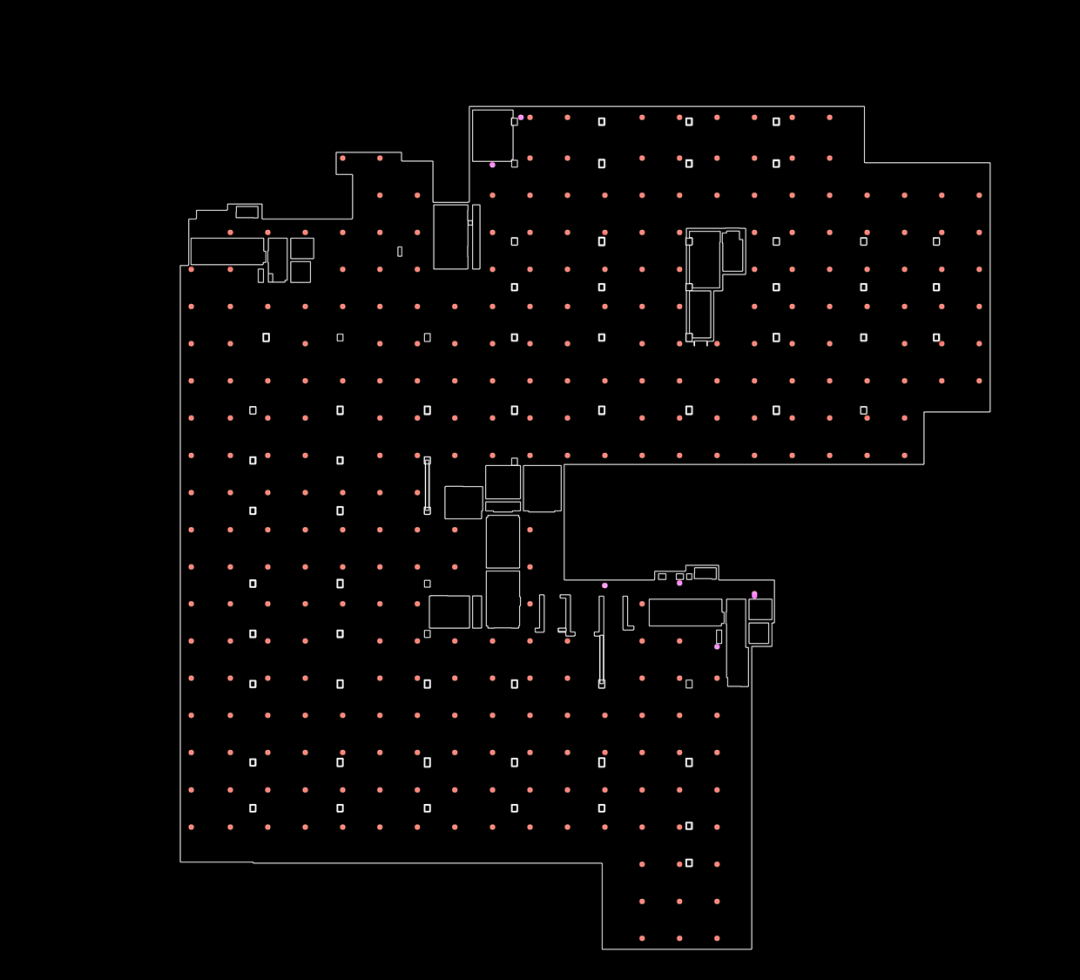 地库喷淋点位的自动布置存在诸多难点,我们可以将难点简单的描述为,在地库平面图中,找出能够完整覆盖该空间的复数的喷淋点位,且喷淋点位的数量最少。