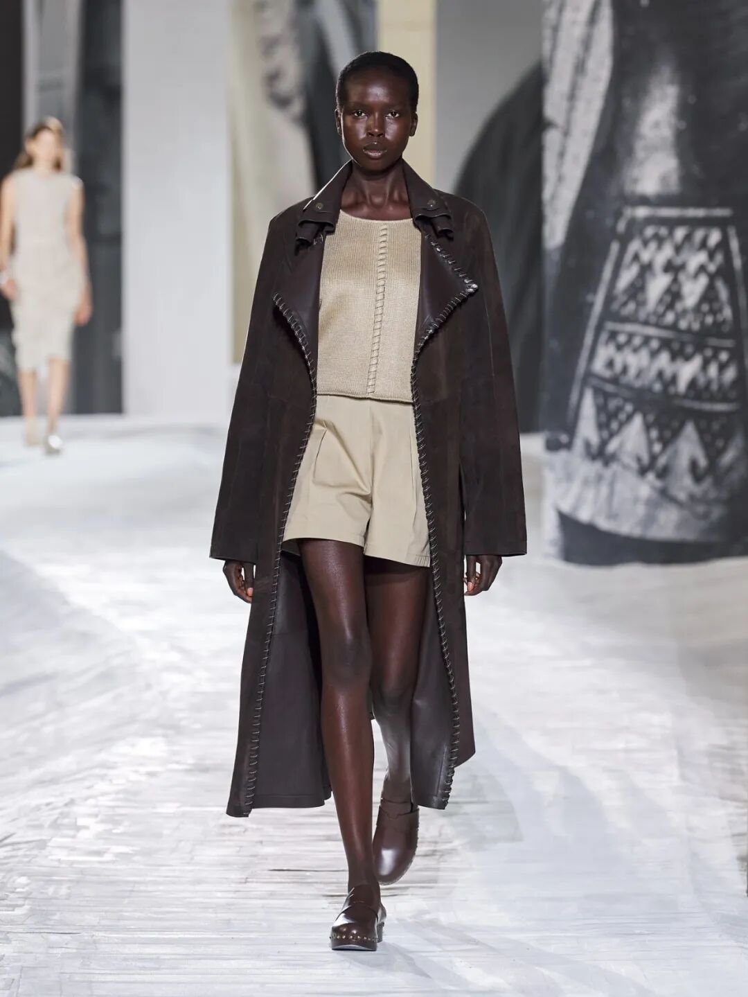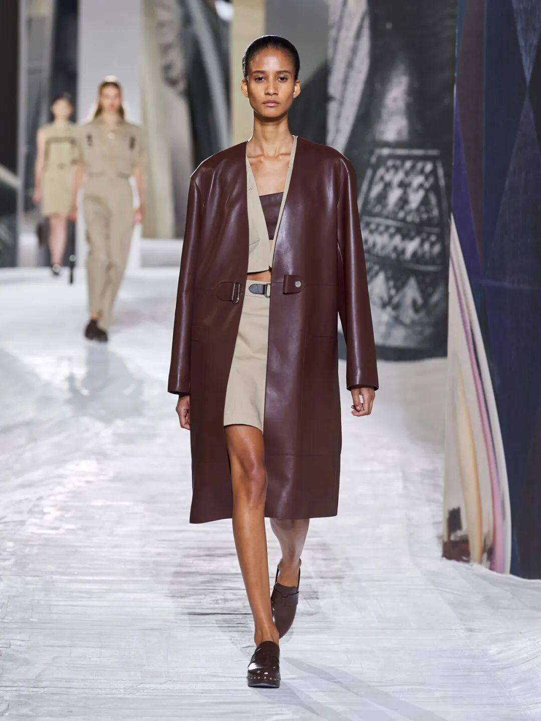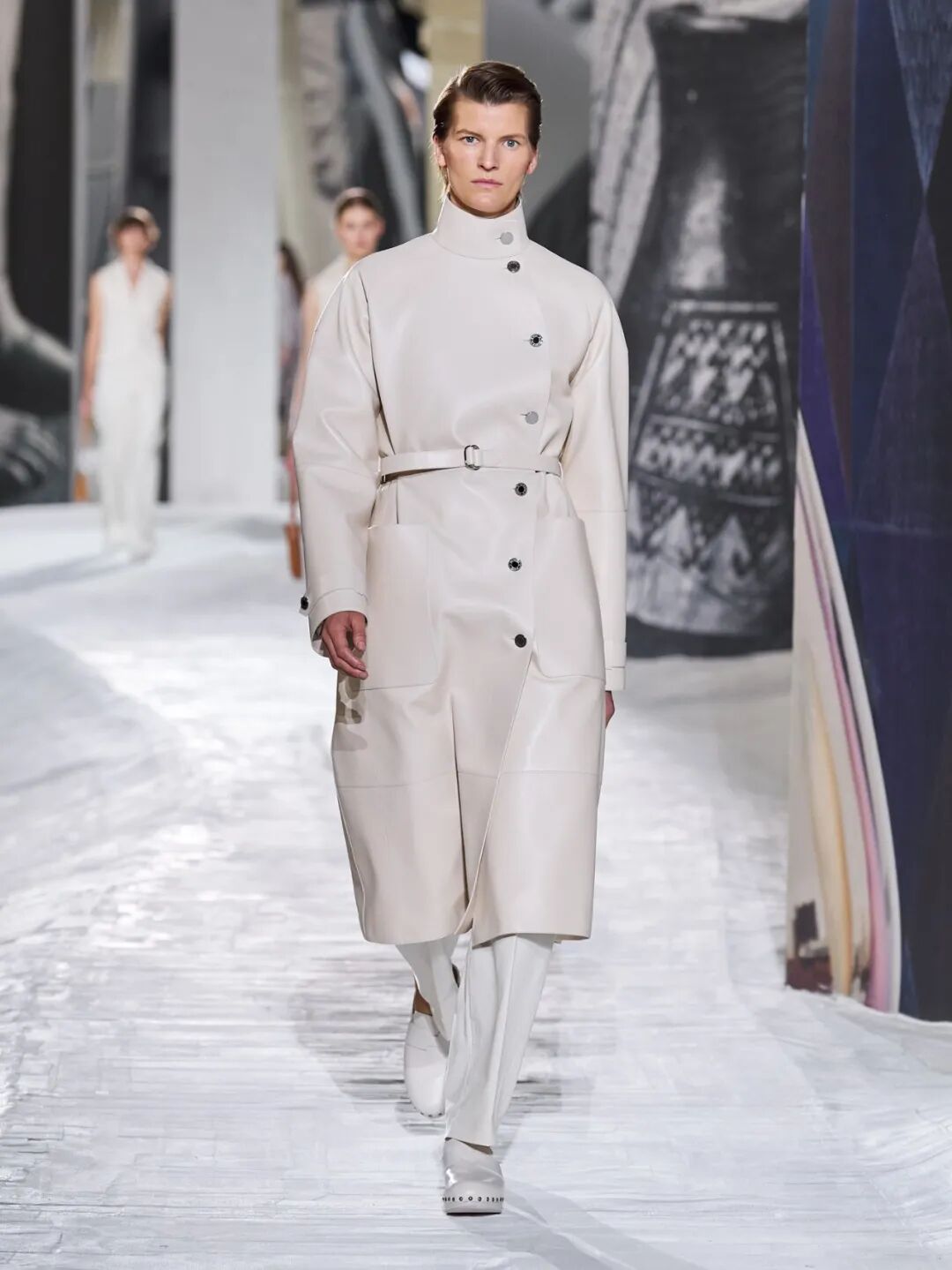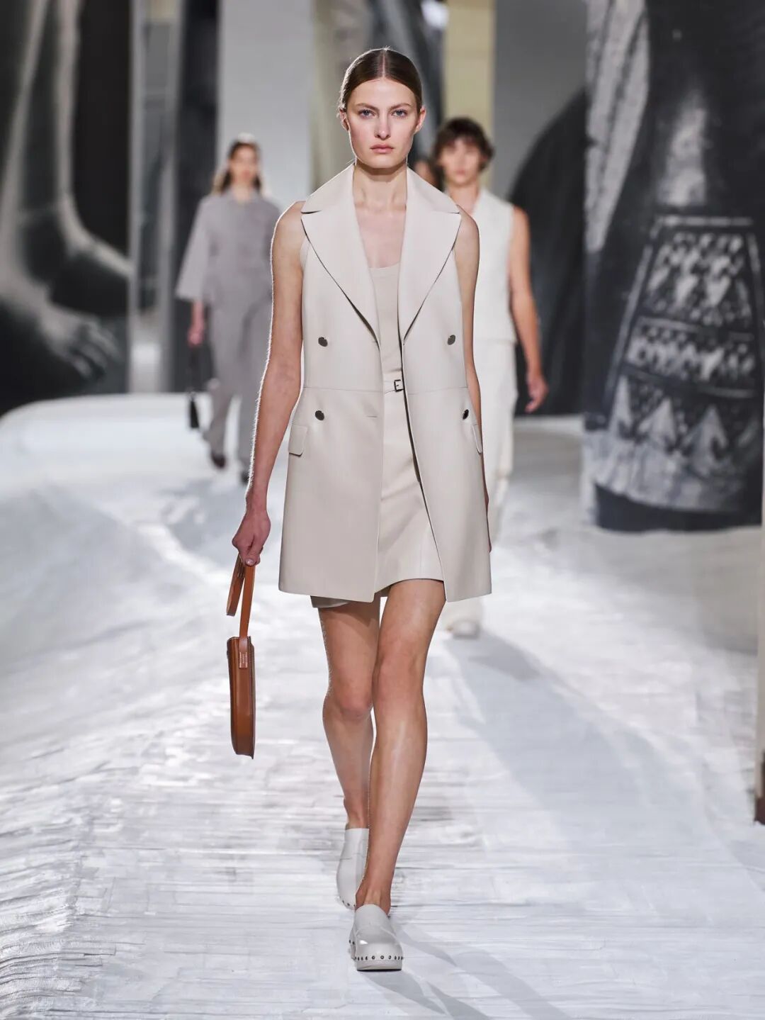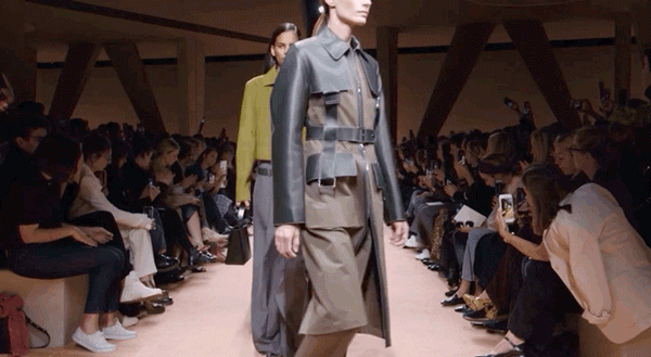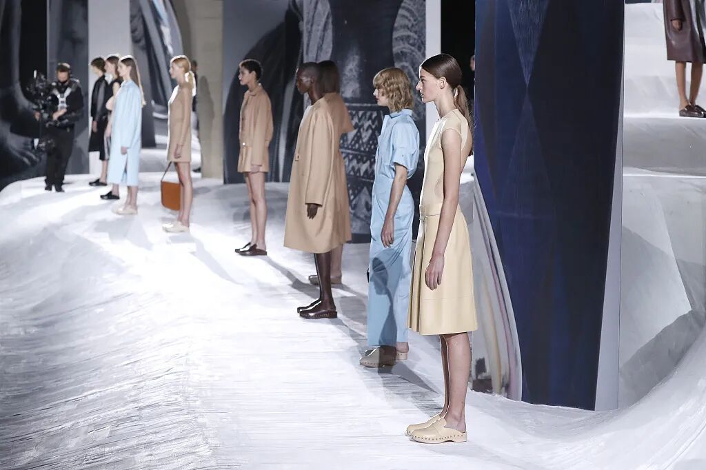 Hermès Spring 2021 把秀场打造成一个矗立在山丘上的装置,Hermès 的标志被封印在石柱上,大秀开始后,模特穿梭在“石柱”之间,怡然地行走于几何之中,诠释着新时代女性的优雅蜕变。