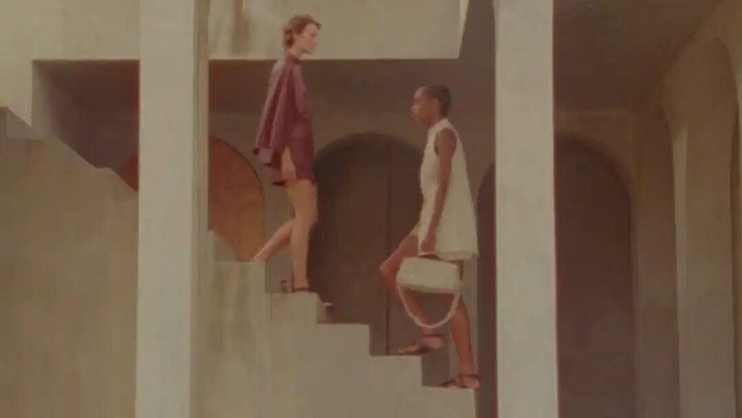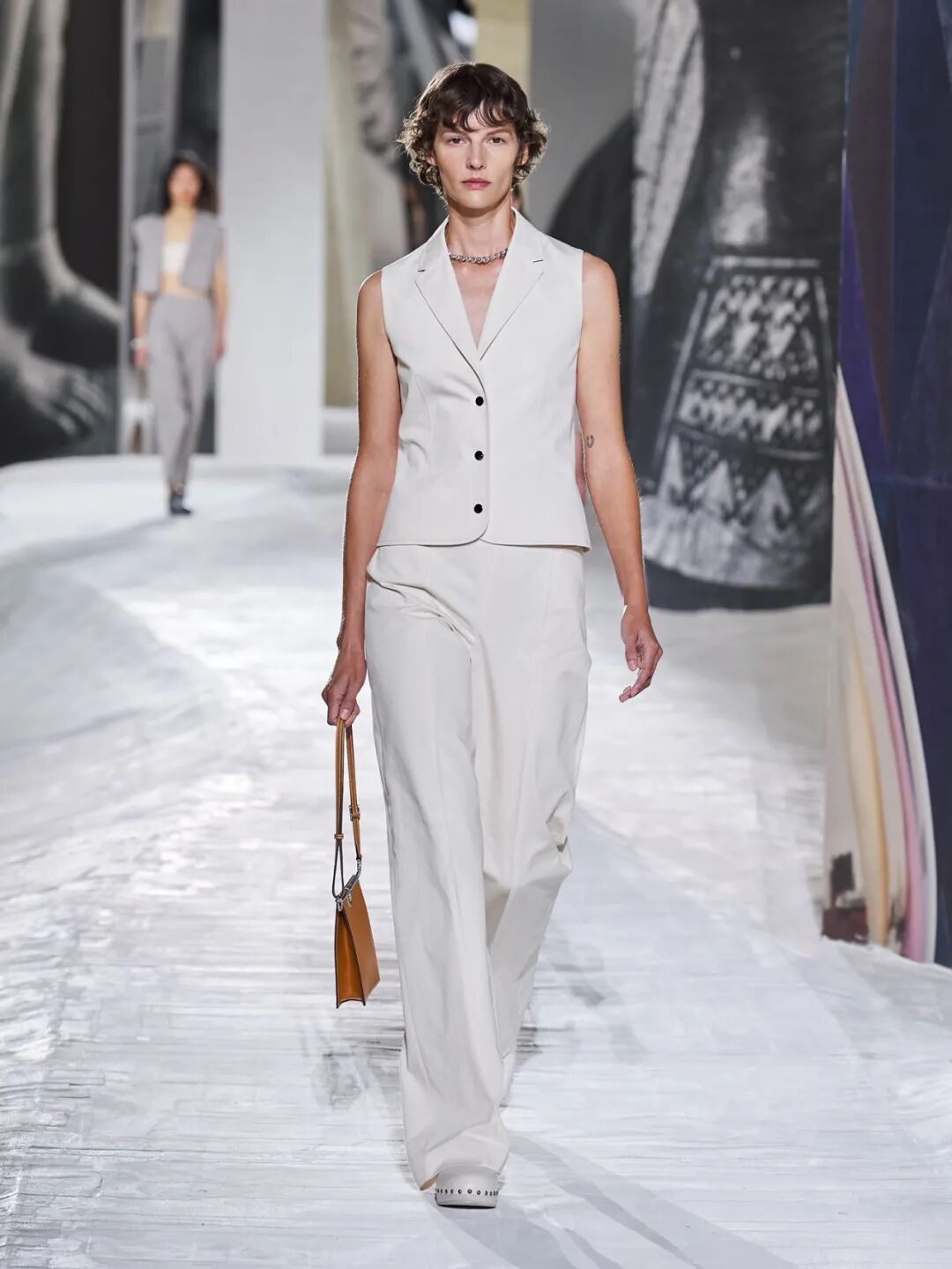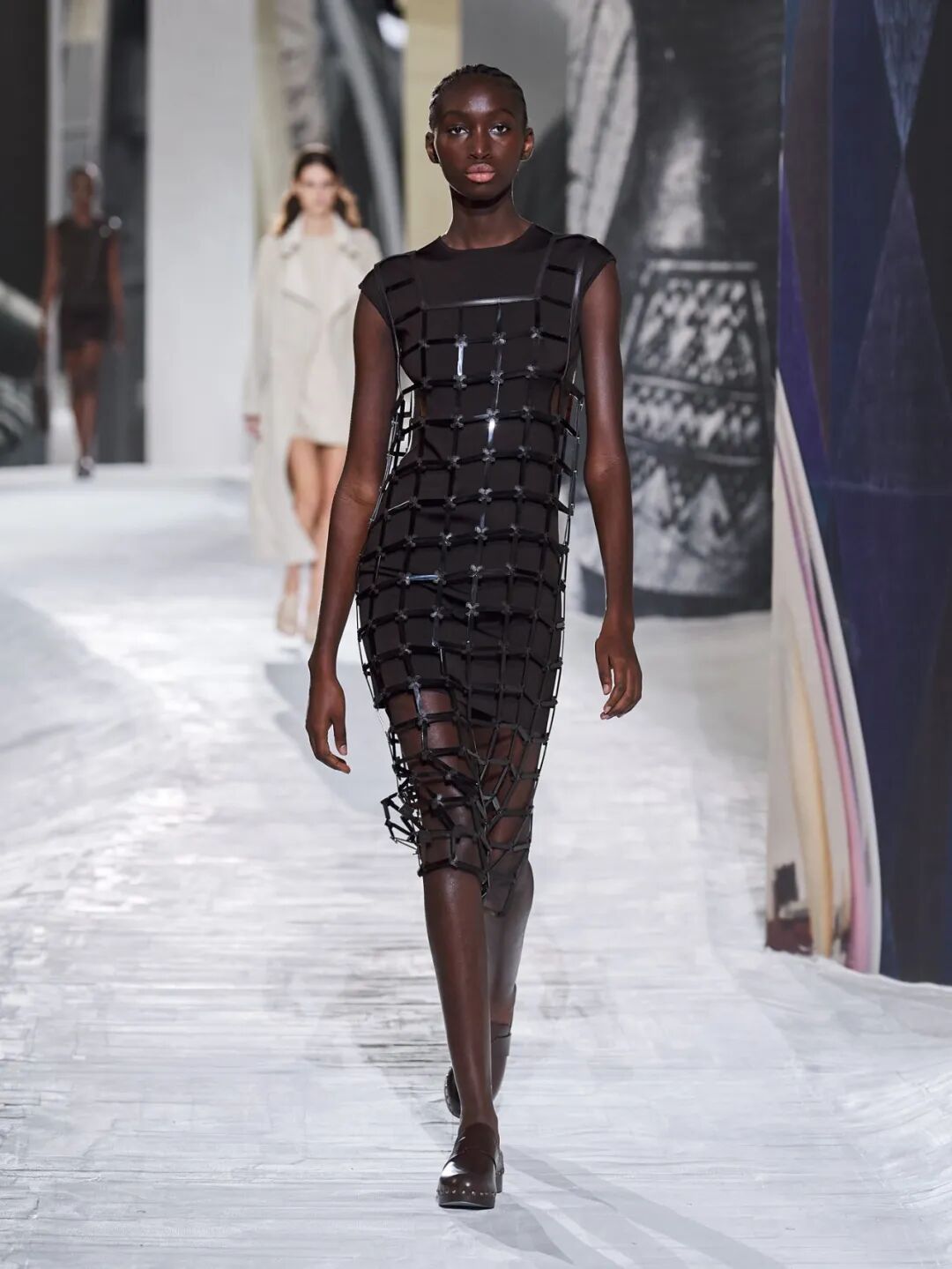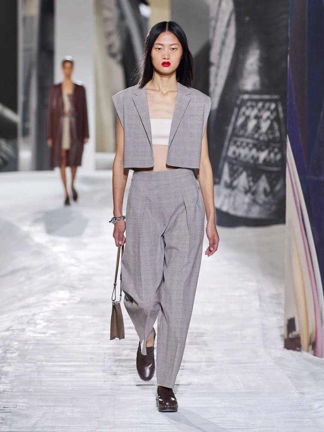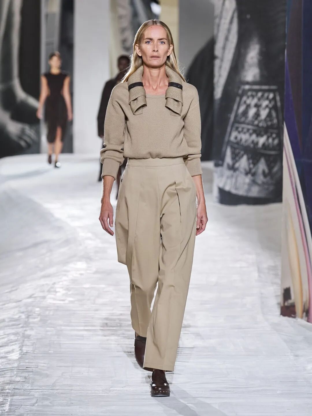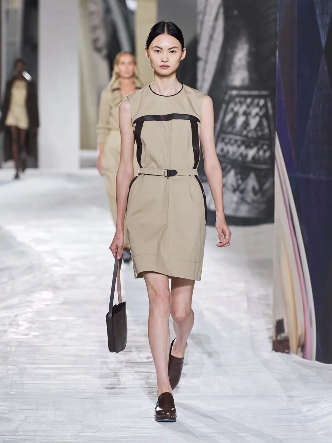 Hermès Spring 2021 把秀场打造成一个矗立在山丘上的装置,Hermès 的标志被封印在石柱上,大秀开始后,模特穿梭在“石柱”之间,怡然地行走于几何之中,诠释着新时代女性的优雅蜕变。