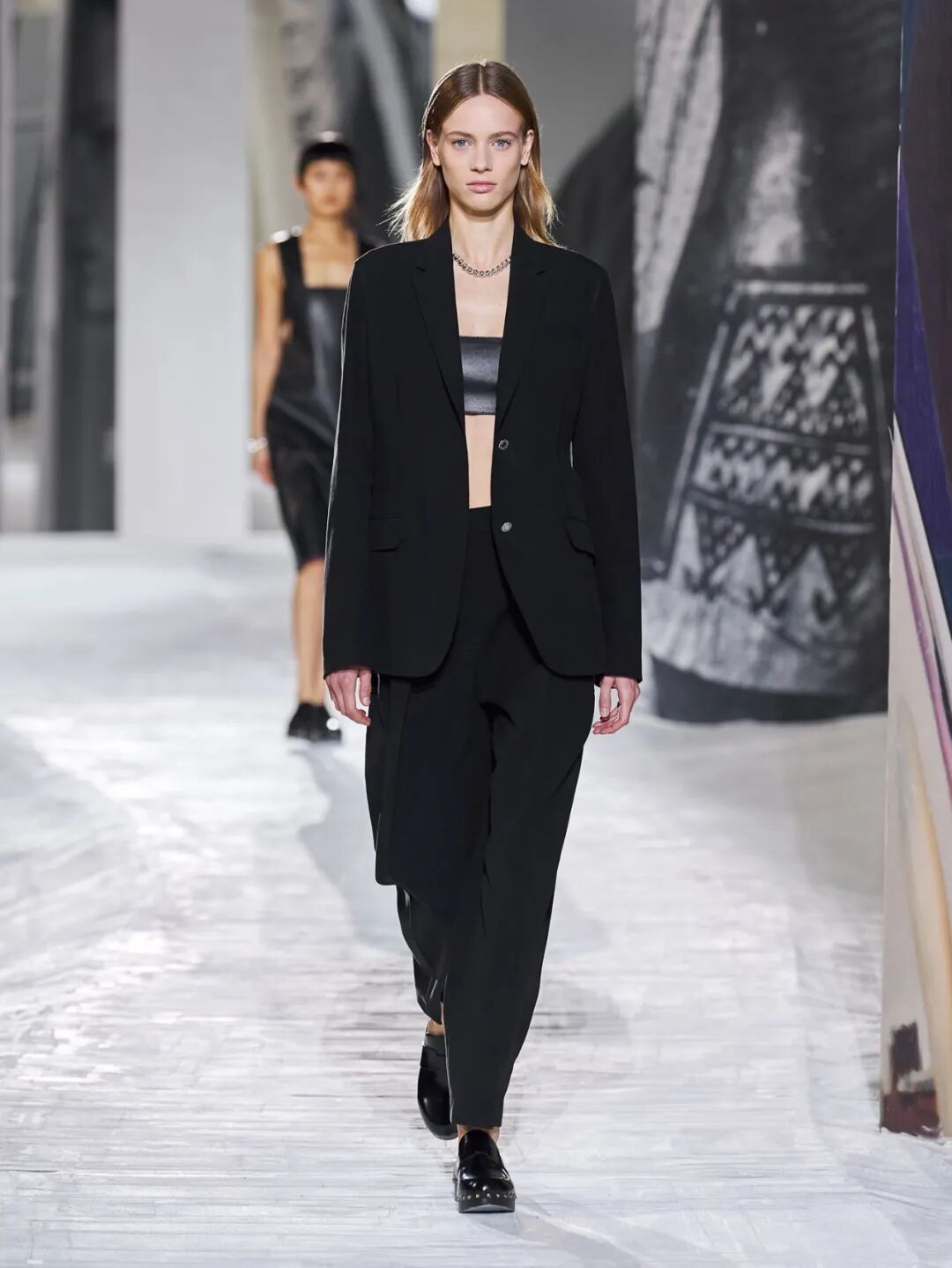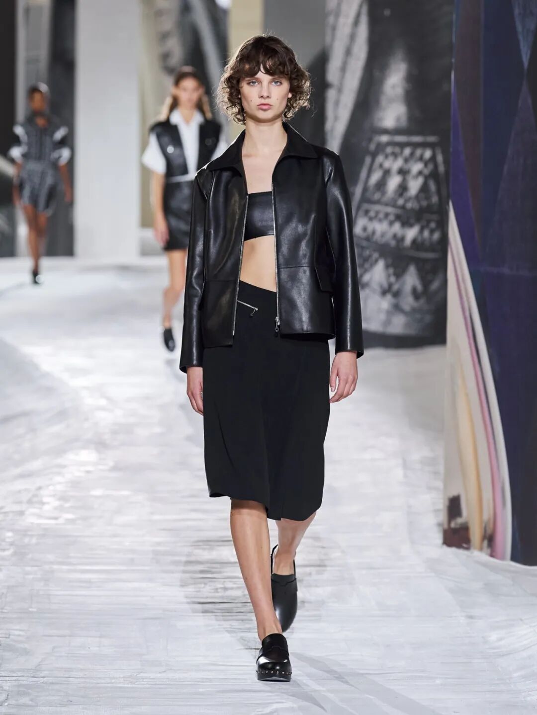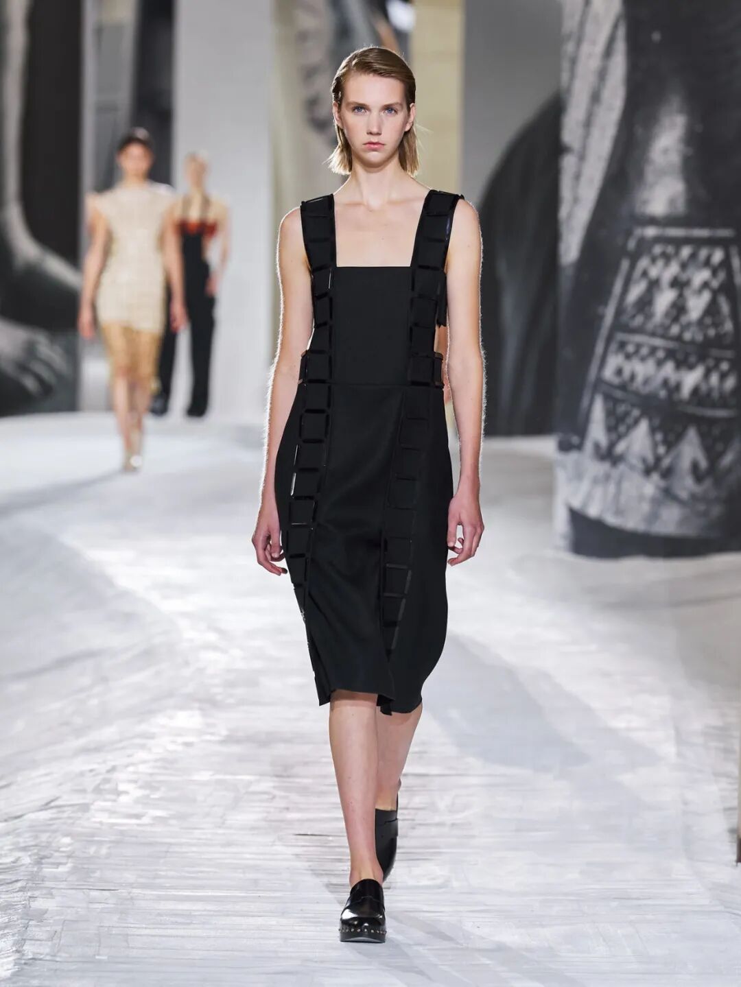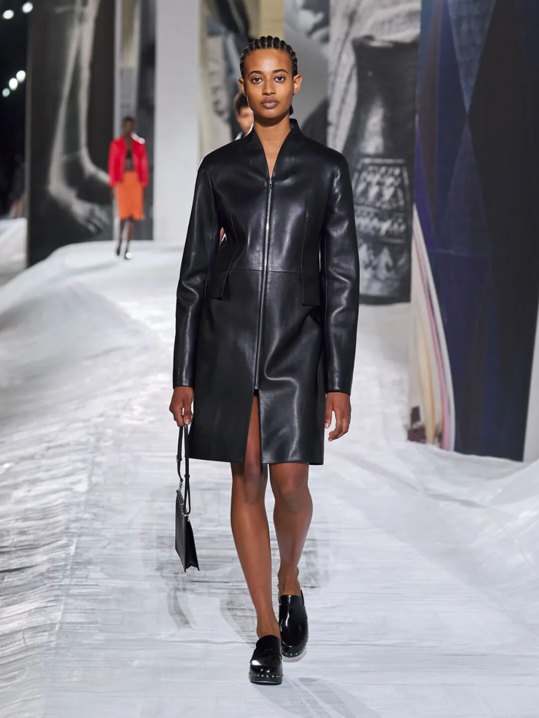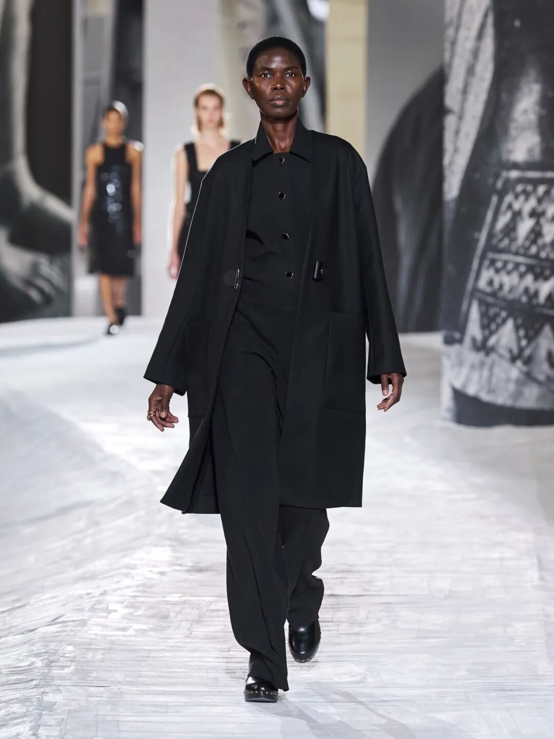 Hermès Spring 2021 把秀场打造成一个矗立在山丘上的装置,Hermès 的标志被封印在石柱上,大秀开始后,模特穿梭在“石柱”之间,怡然地行走于几何之中,诠释着新时代女性的优雅蜕变。