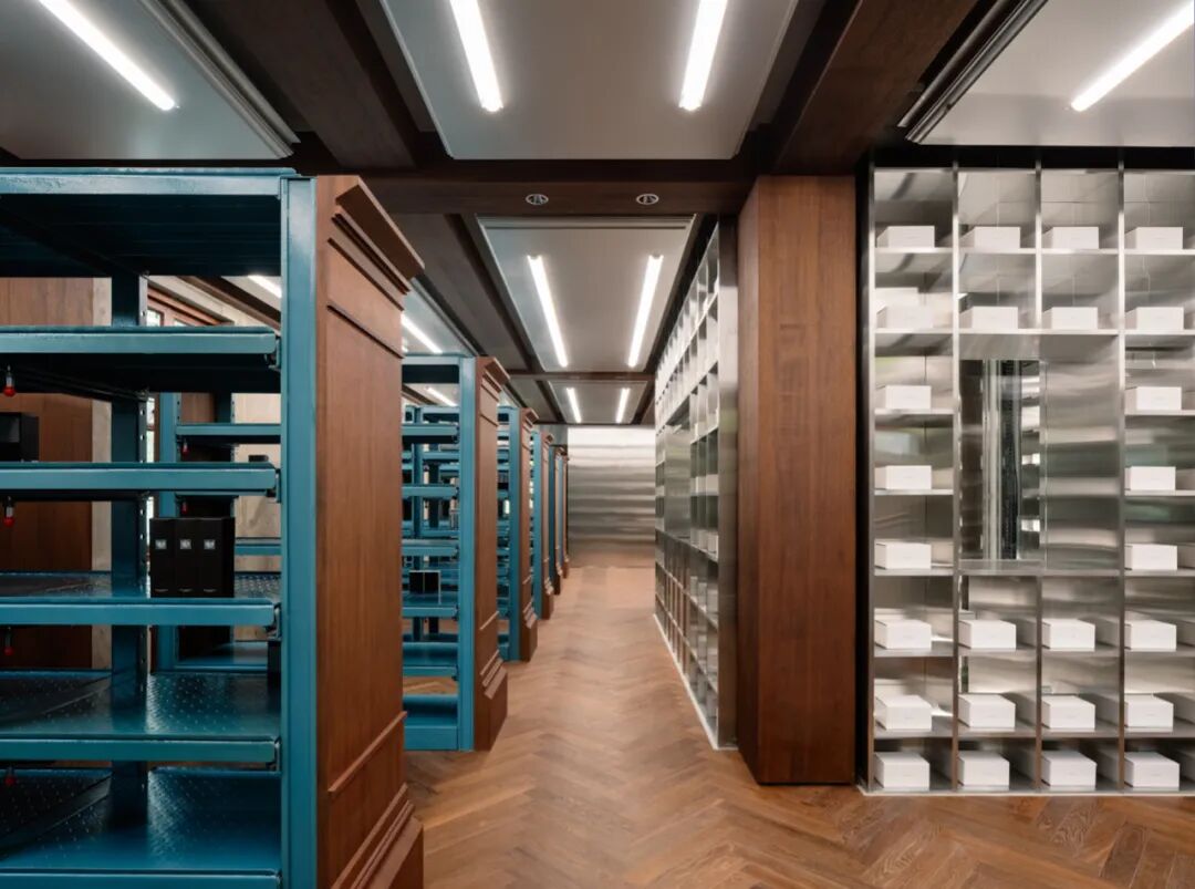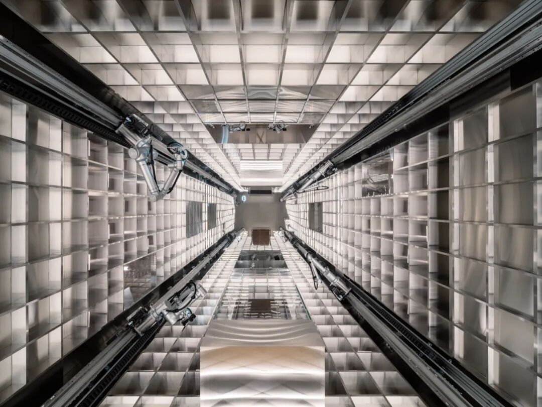 AIM 试图通过增加新的时间和空间结点,为到访者提供全新的视角来看待品牌的仓储文化。两个垂直的元素穿插在建筑中,象征连接这些时间层次。第一个垂直仓储核心筒是由机械臂管理的,长达三层的智能货舱, 另一个则是体验楼梯,宛如时间容器般引导着人们在建筑中穿梭。