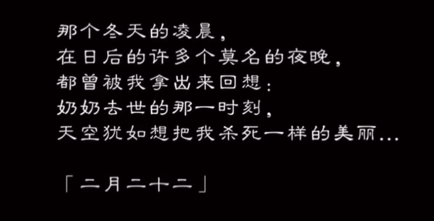 视频的最后,金世佳写道:那个冬天的凌晨,在日后的许多个莫名的夜晚,都曾被我拿出来回想:奶奶去世的那一时刻,天空犹如想把我杀死一样的美丽……