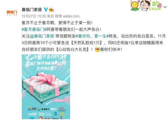 此次联合接力,围绕#喜欢你,爱一生#喜临门率先发声,各家品牌蓝V齐刷刷地跟上了喜临门的主情感基调,分享花式告白宣言。从家居厨具到美食再到婚恋平台,涉及生活消费各个领域,让这场由喜临门引领的蜜月派对变得更为甜蜜。