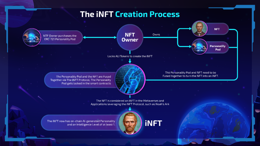 Personality Pod 可以与任何 NFT 融合并使其变得智能,使其拥有 “生机”。可以认为 Personality Pod 封装了一个真正去中心化、独特和智能的 “数字灵魂”。iNFT 智能融合的过程需要 iNFT 协议的支持。