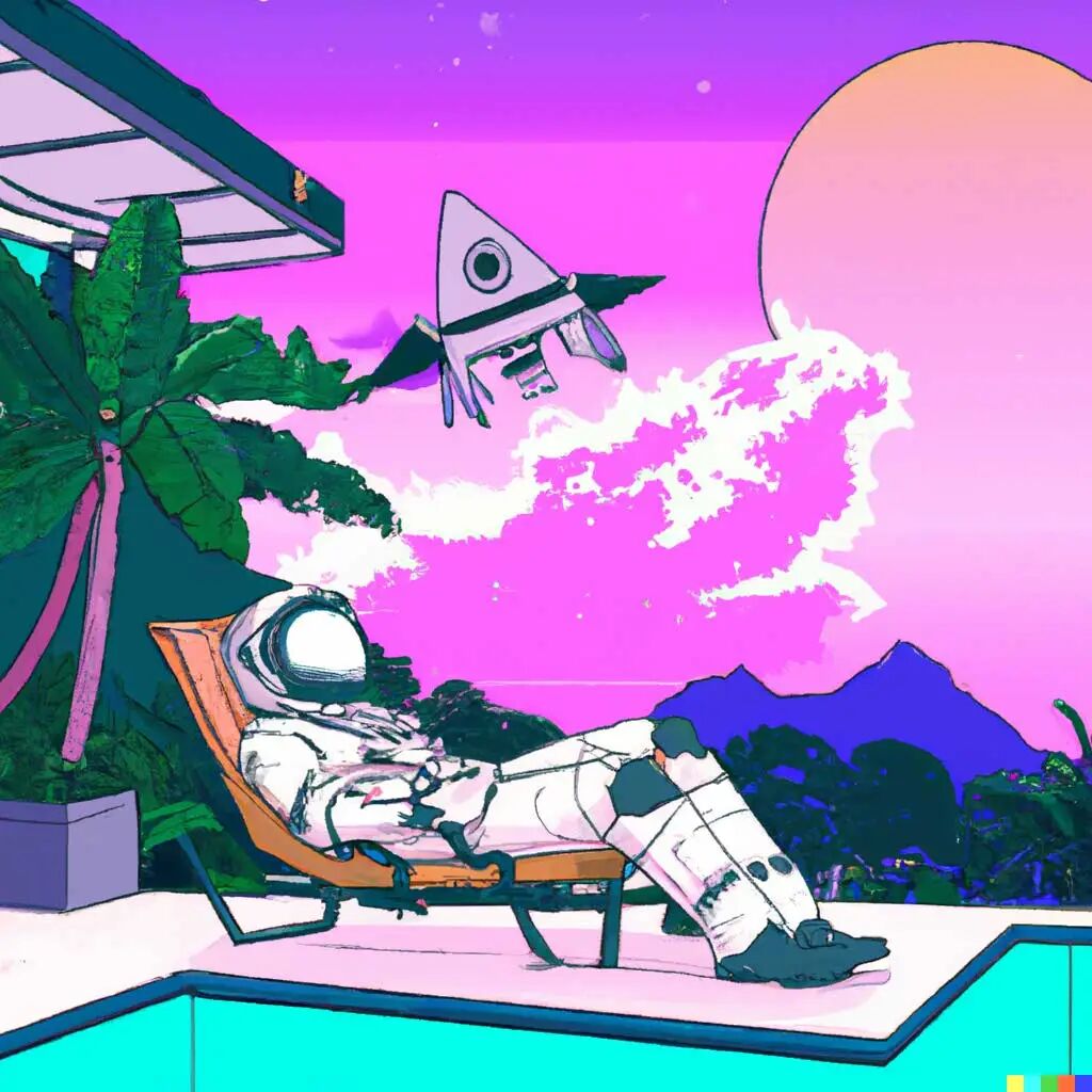 蒸汽波风格,一位宇航员在太空中的热带度假胜地。