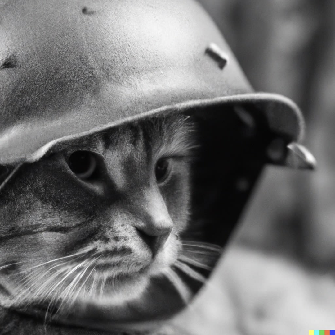“战斗中戴着士兵头盔的猫猫特写 - 二战历史摄影风格,黑白”