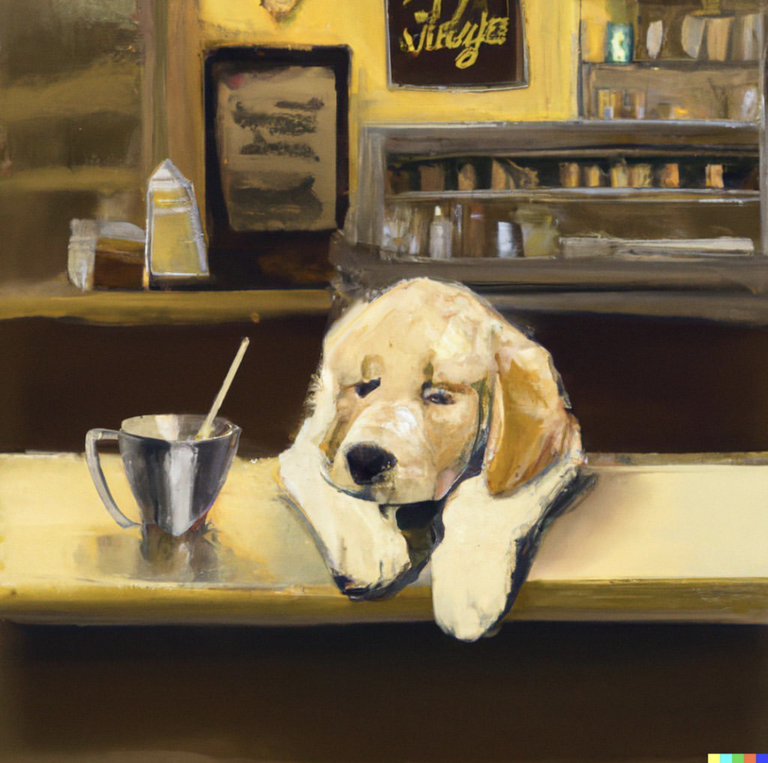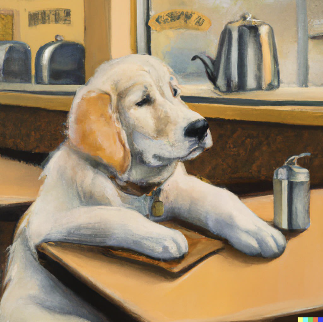 “金毛寻回犬小狗坐在小餐馆里喝咖啡,看起来很忧郁 - Edward Hopper风格”