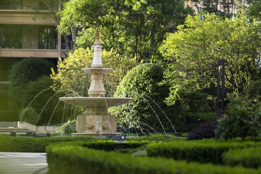 近1400㎡泳池的设立为场地增添一份生机,结合跌水给整体画面带来动静结合的感受。前场的泳池景观与中庭高差产生的跌水景观提供不同的水景感受,立面绿植与跌水互相交织,平台之间错落穿插咬合,构筑物与景观自然相互渗透。既保证了隐私的前提下,为居者提供了更好的视线的同时,也模糊了泳池与周边的界限,惬意的享受属于此刻的美好。