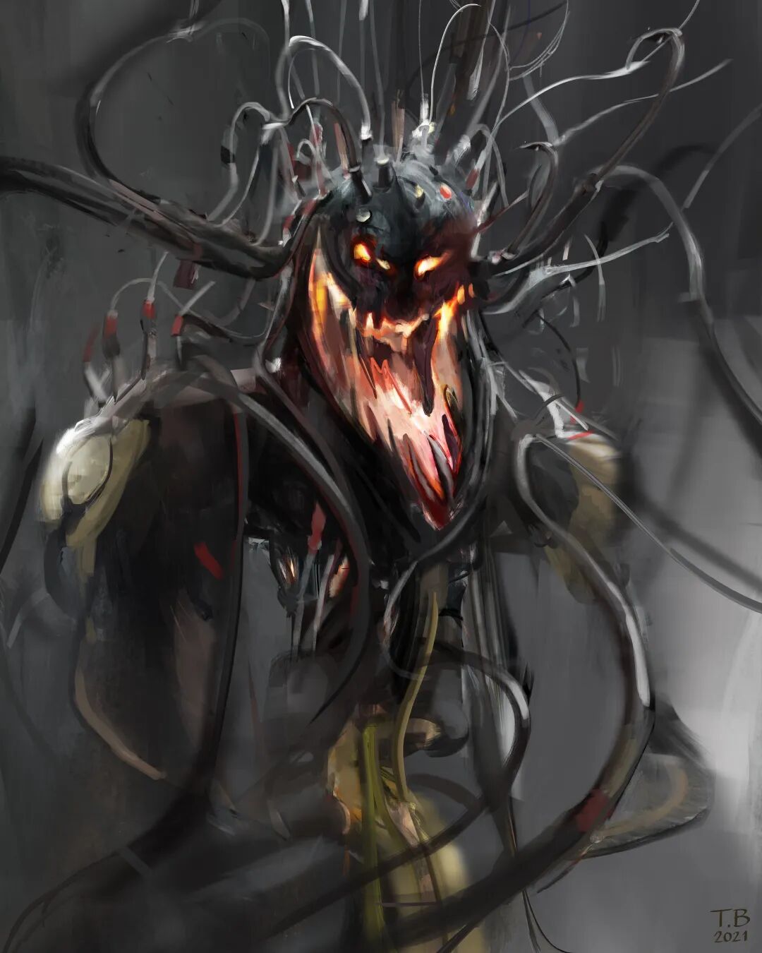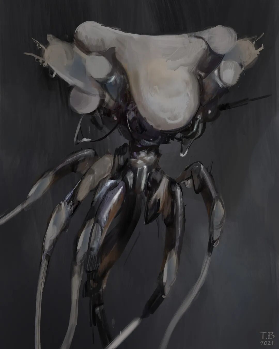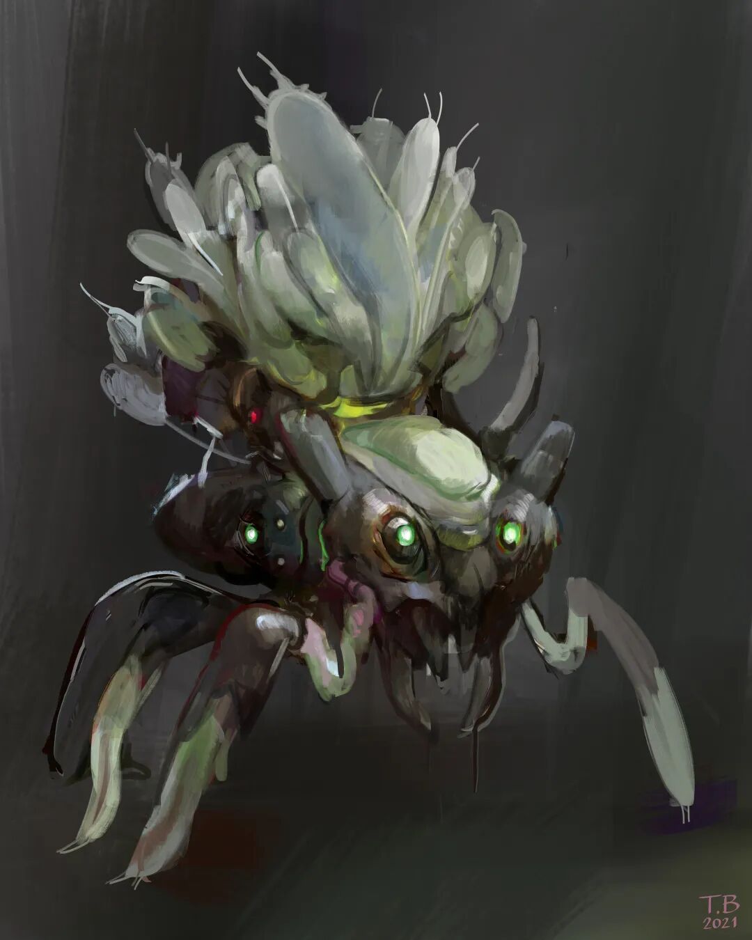 《Monsterbots》系列在Thomas Brissot的作品中有些特别,他将机械和有机生物结合起来,旨在表达厌恶、恐惧、陌生和美丽的抽象视觉,整体近乎黑暗的色调,再加亮色点缀,更突出了一种诡异的氛围感。