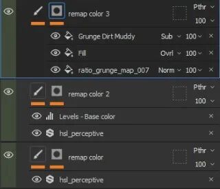 我相信这是对某一材质进行初始工作的最重要方面之一。我把图层设置为透视,使用HSL滤镜,把色调滑动几个百分点。我用grunge map或几个相互混合的grunge map来填充蒙版。我创建了几个这样的图层。
