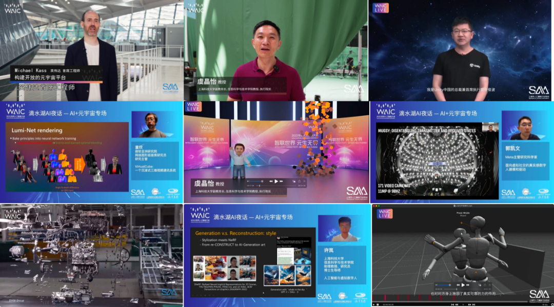 在点亮仪式之后,第一场夜话以“AI+元宇宙”为主题,上海科技大学信息科学与技术学院教授、执行院长虞晶怡的“虚拟人”作为主持人,邀请来自英伟达、Unity、微软、Meta等元宇宙领军企业专家共话AI+元宇宙,探索元宇宙行业前沿进展。