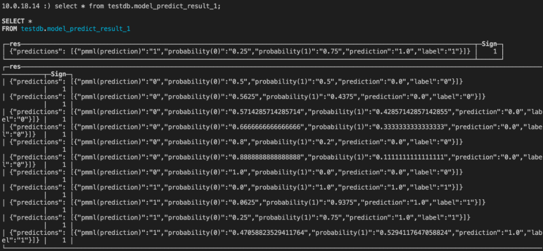 -- 创建数据库CREATE DATABASE IF NOT EXISTS testdb ON CLUSTER default_cluster;-- 创建表CREATE TABLE testdb.model_predict_result_1 on cluster default_cluster (res String,Sign Int8) ENGINE = ReplicatedCollapsingMergeTree('/clickhouse/tables/{layer}-{shard}/testdb/model_predict_result_1', '{replica}',Sign) ORDER BY res;