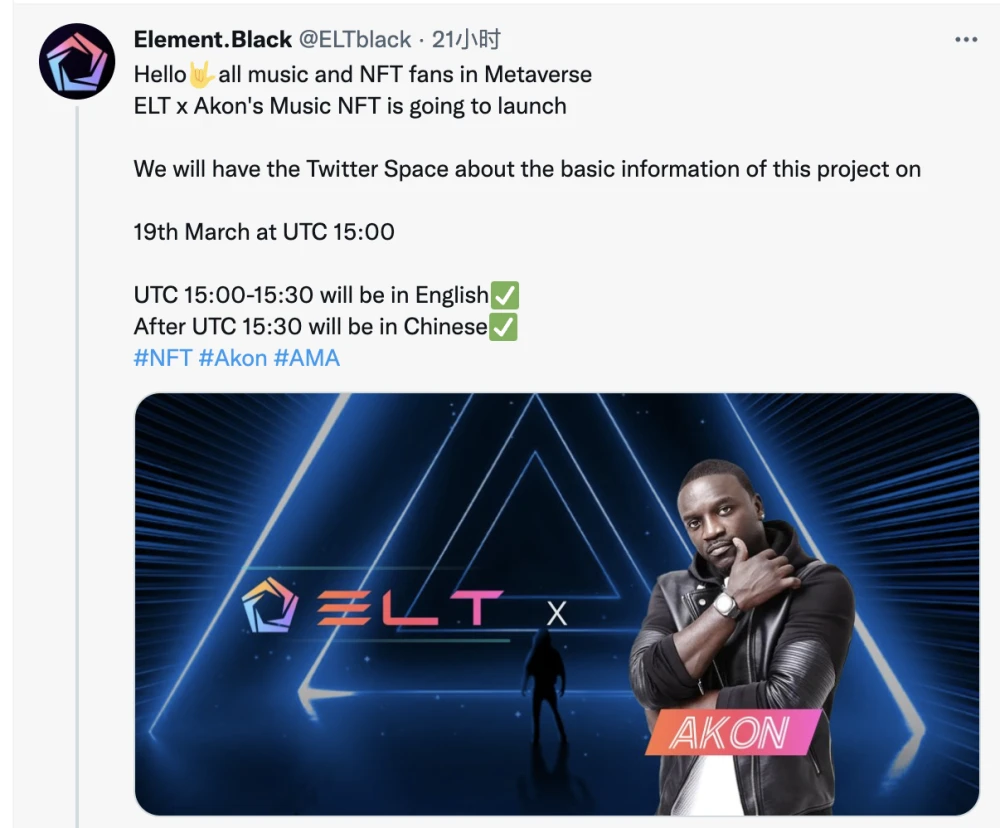 国际说唱巨星 Akon 于 3 月 19 日晚参与了音乐平台类NFT项目 ELEMENT BLACK Twitter Spaces 活动,并与社区成员透露了ELT项目未来 Create To Earn 部分规划。项目将于四月中旬发售 Akon Music NFT 系列和平台治理代币。