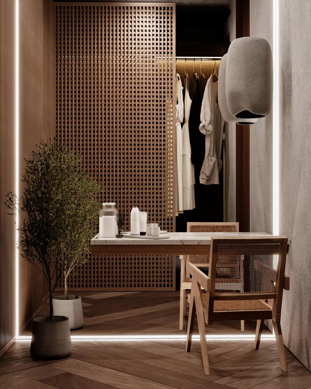 A small wooden tea table is placed at the door of the dressing room, which gives more functions to the space, allowing residents to entertain guests and drink tea together in their spare time.