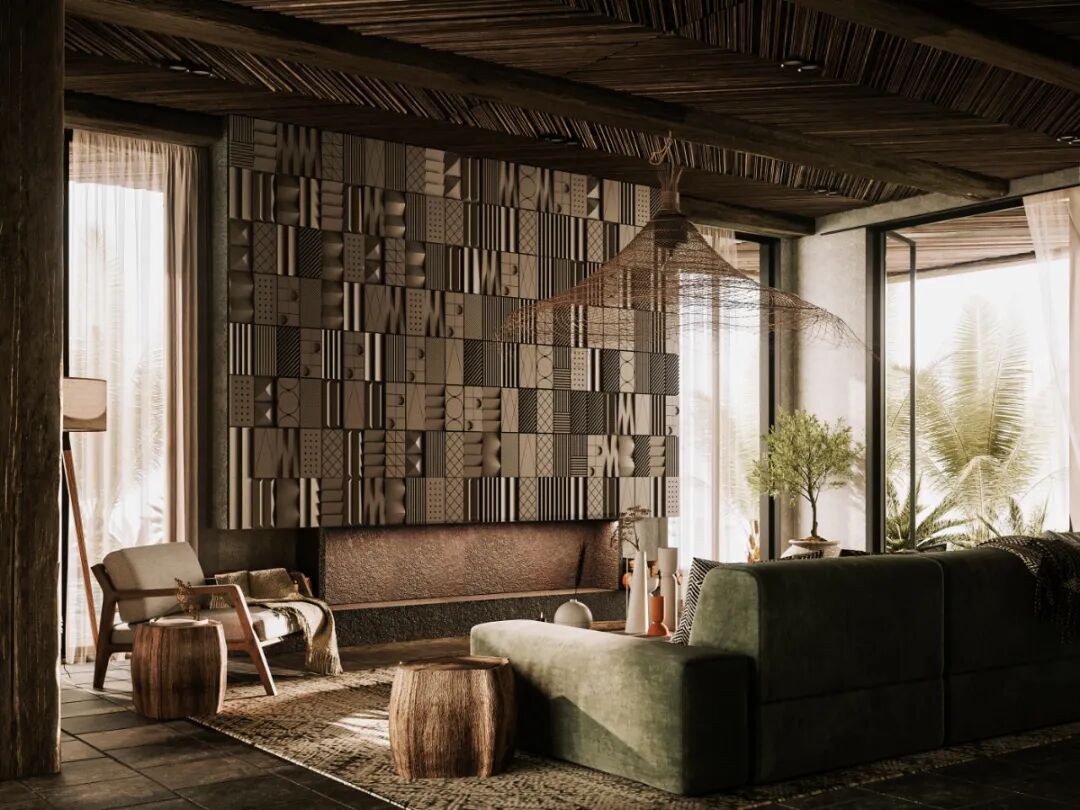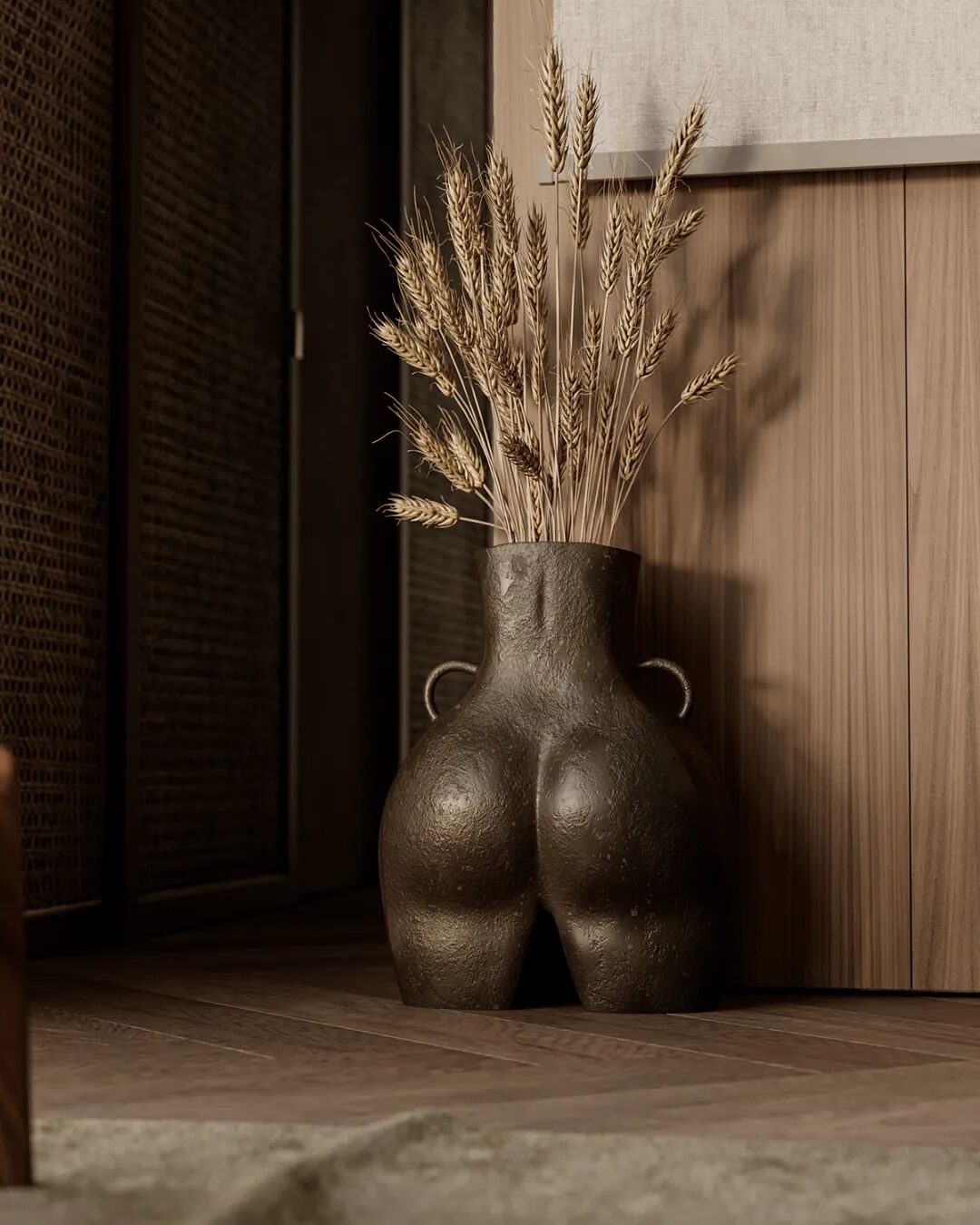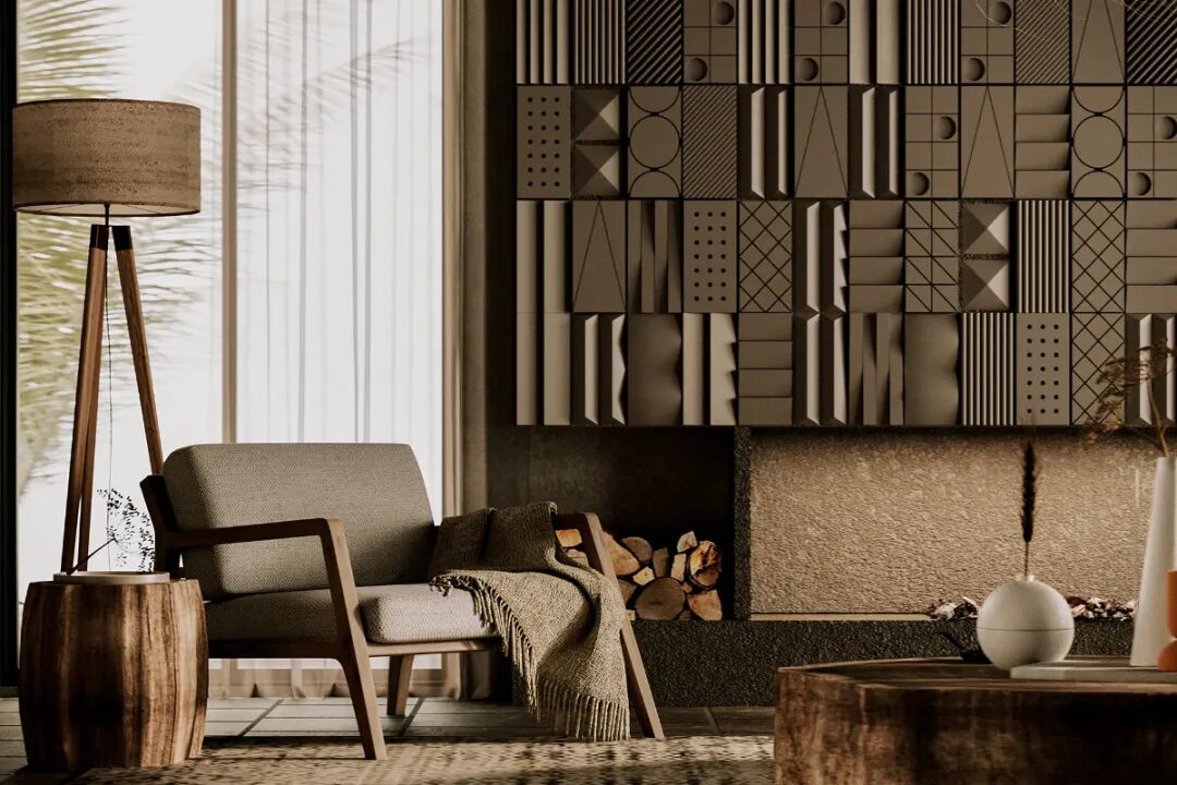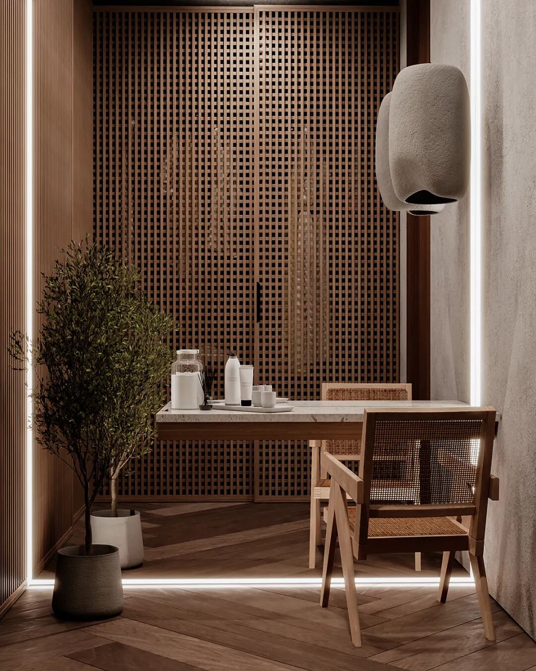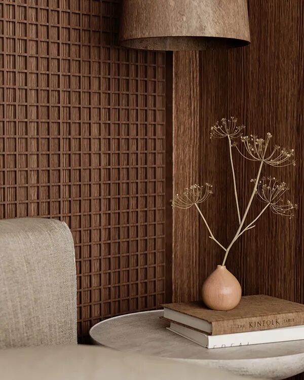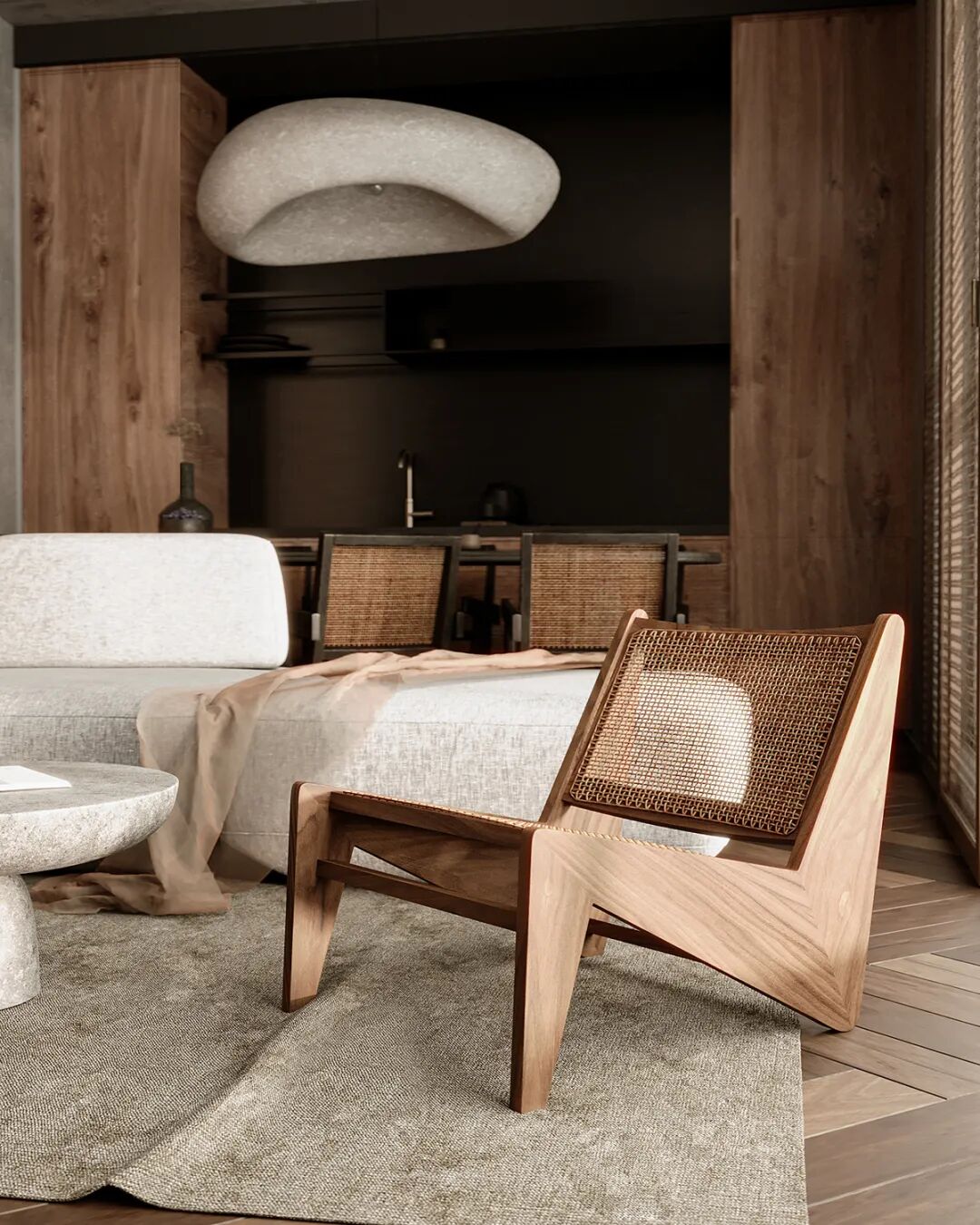 The walls in the living room are full of delicate wooden textures, and with the peculiar wooden chairs, everything looks so arbitrary. Uniquely shaped vases add energy to the interior.