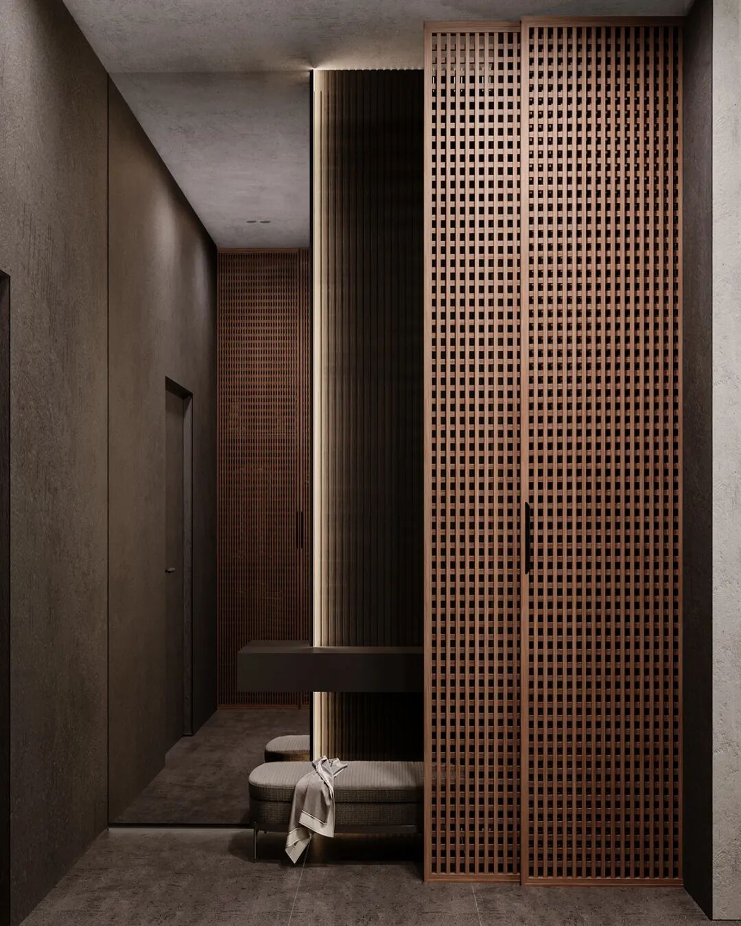 更衣室门口摆放了一张木质的小茶桌,为该空间赋予了更多的功能,能够让居者在闲暇的时候招待客人在此一同饮茶。