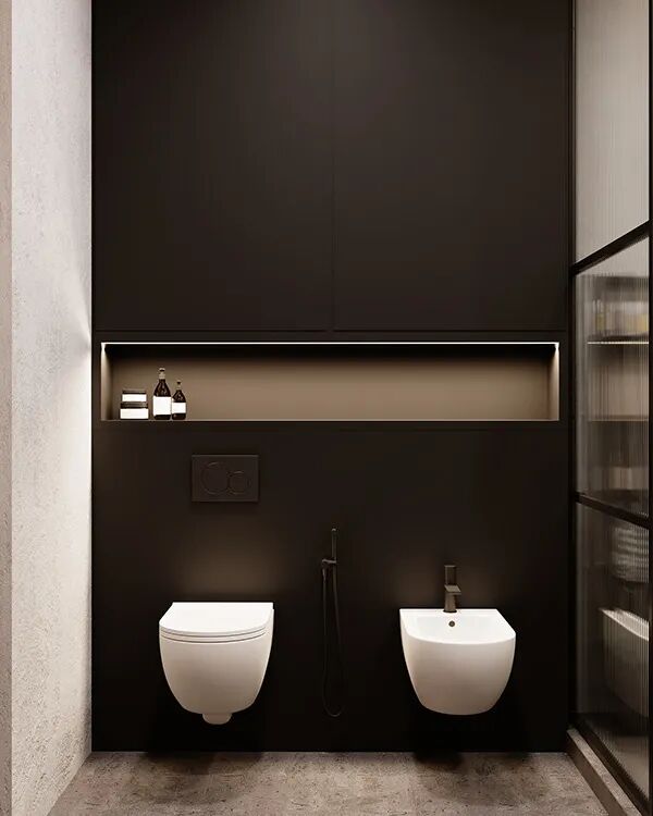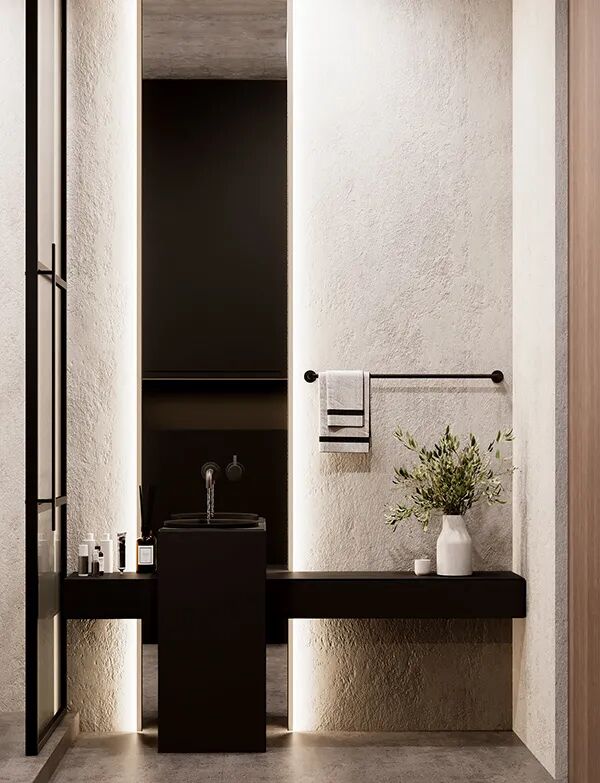 盥洗室斑驳的石膏墙为室内增添了不少质感,通过一些简约的金属设施来进行装饰,室内的设施精致美观,在内嵌式灯带的照射之下,折射出不同的金属光泽。