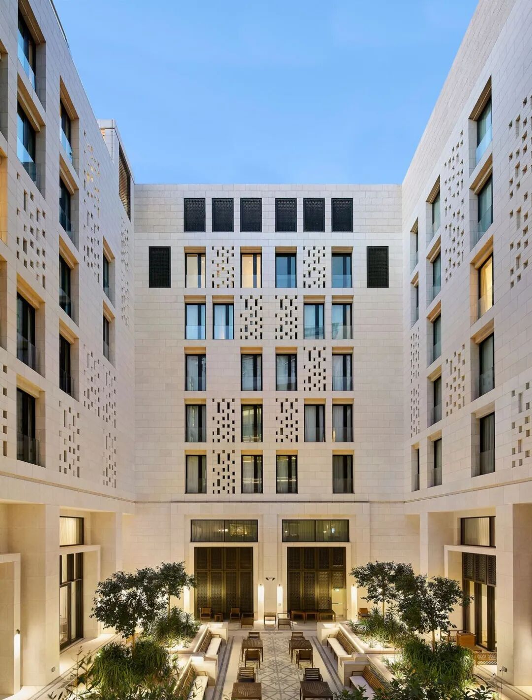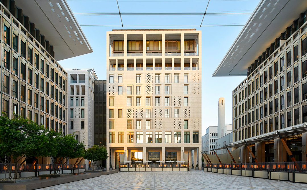 建筑的庭院配置和立面的雕刻处理都受到传统卡塔尔方言的影响,并以当代的方式重新诠释。“建筑和空间在计划中被仔细地连接起来,以避免任何厚重的感觉,并在酒店和公寓建筑内创建一个阴凉、宁静的绿洲,” John McAslan + Partners 解释说。