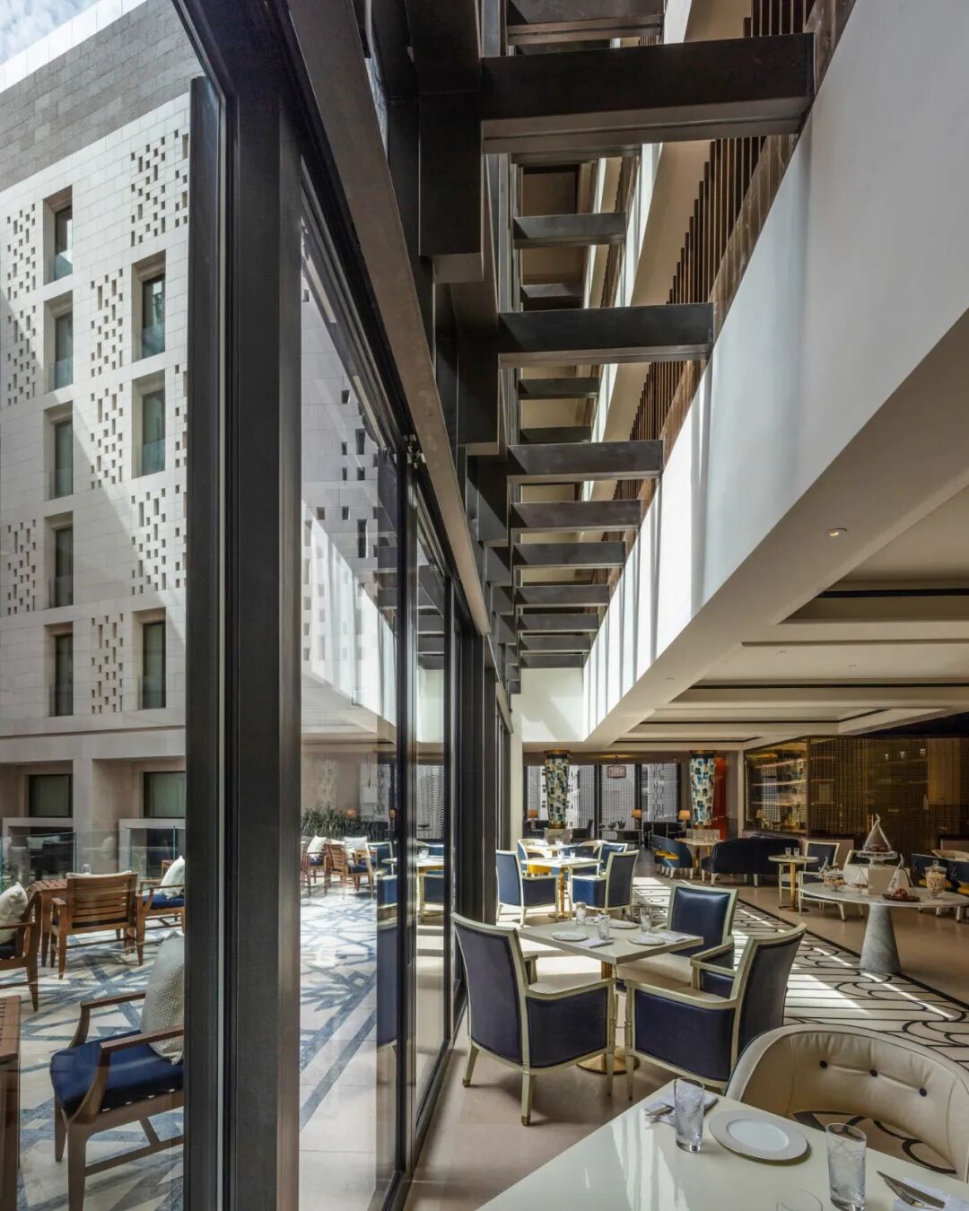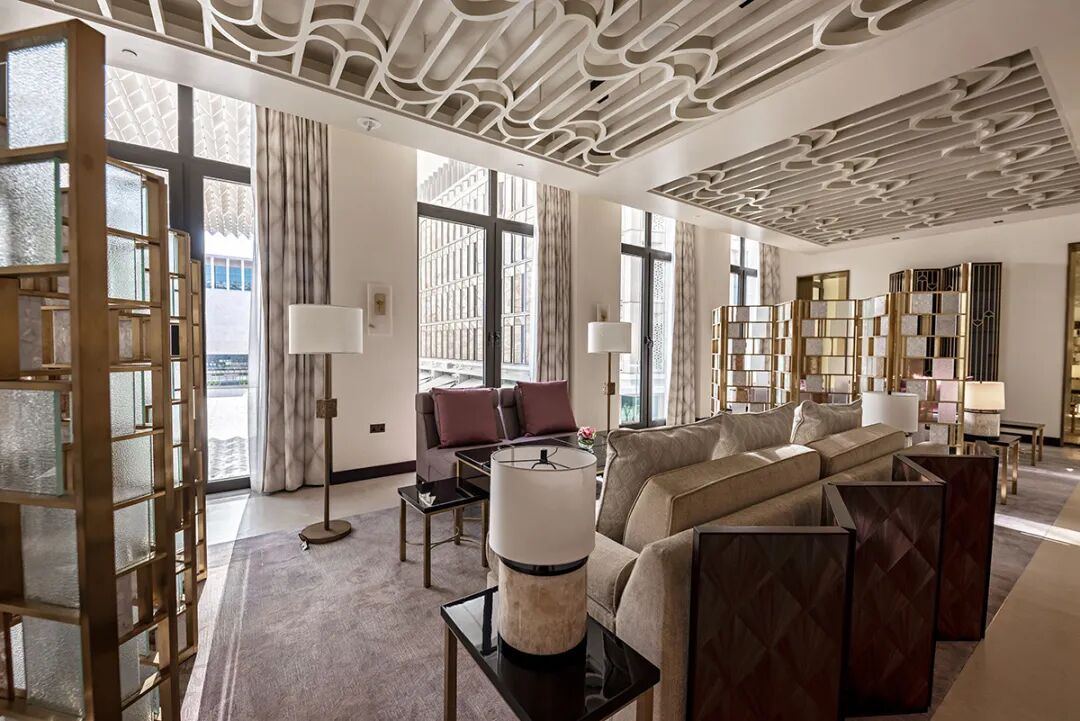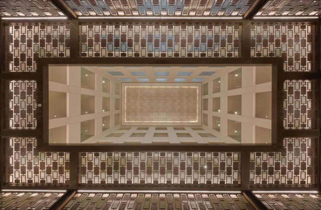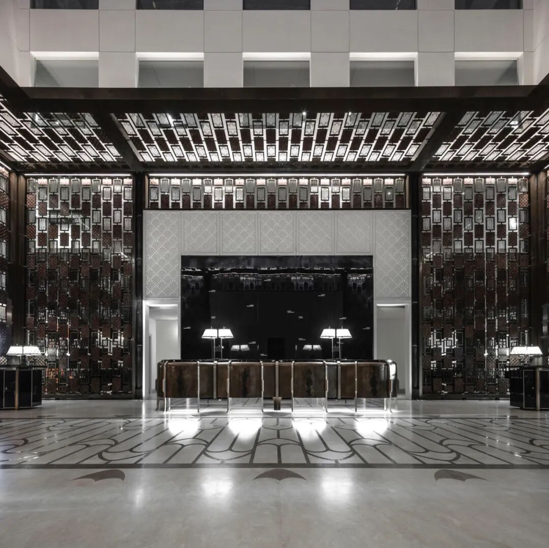建筑外立面的“雕刻式”设计手法巧妙地延续到大堂空间。多遮蔽格栅的传统卡塔尔建筑特色,从外延持续走入更贴近人们的细节。