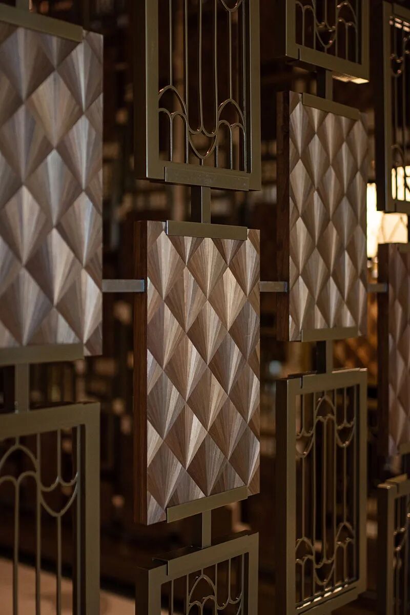 屏风不仅呼应了建筑外立面,提高透视,更展现了高度的工艺细节,直观地带来艺术感、雕刻性。由于当今掌握麦秆镶嵌技艺的匠人十分有限,如此大面积的饰面全部由工匠纯手工完成,经过 6 个月的打磨。