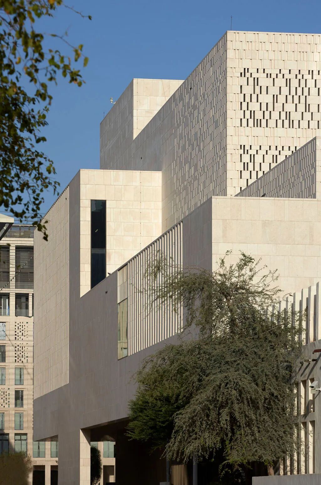 它的线性设计与复杂的顶篷和百叶窗系统相呼应,可以保护广场免受恶劣的多哈热浪影响。这些可调节气候的屏幕调节日光和温度,使人们更易于在户外徘徊。