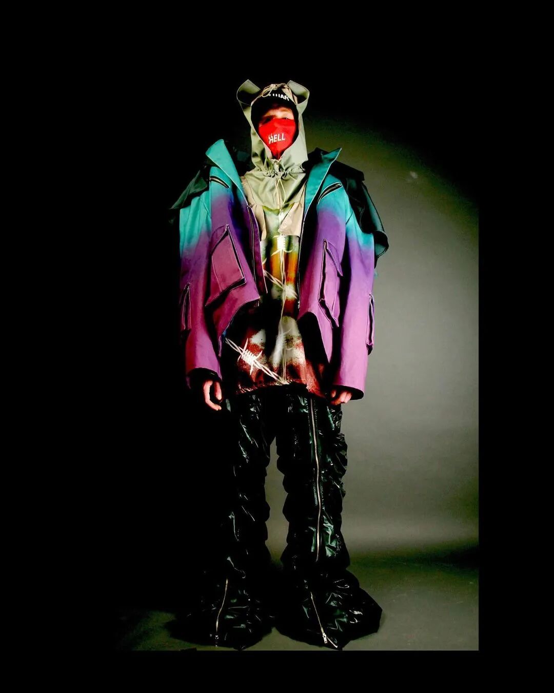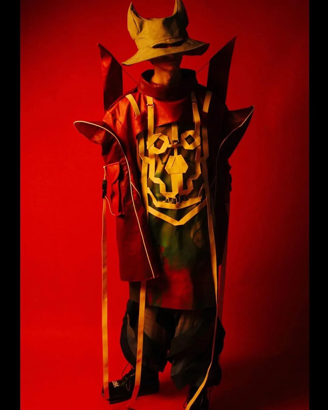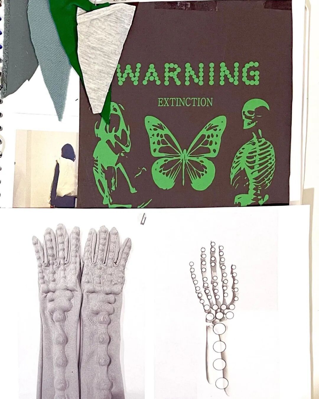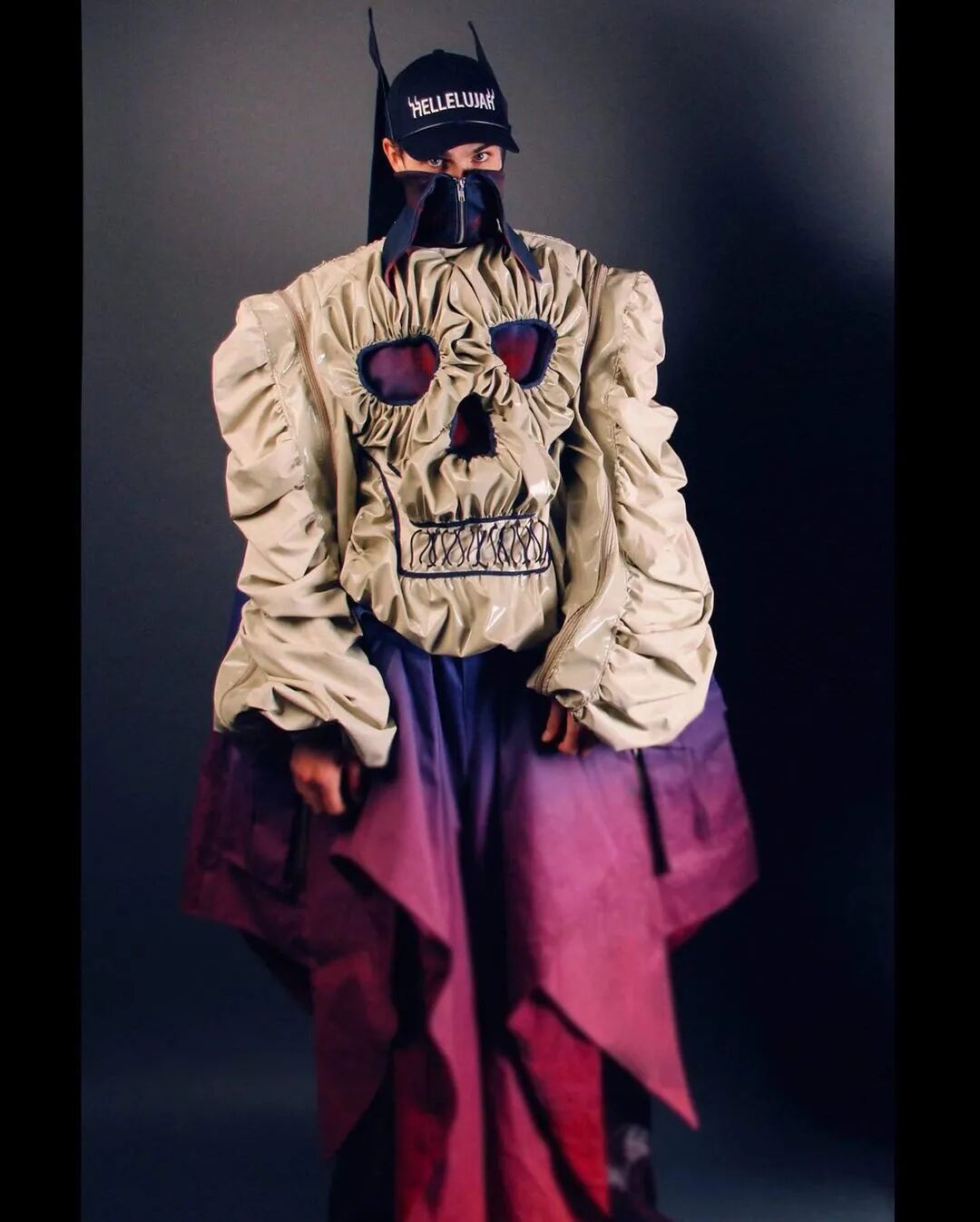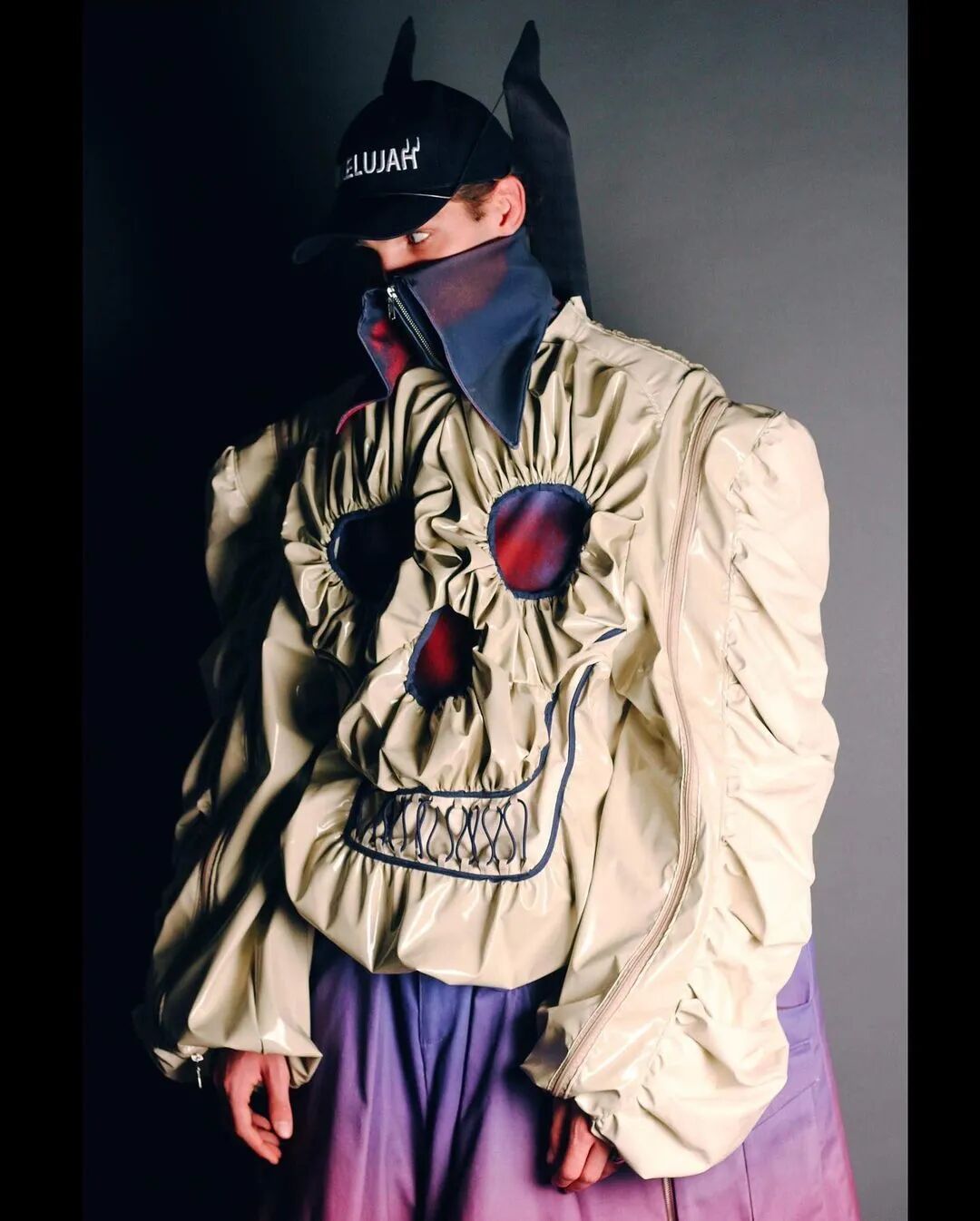 “我开始我的系列时,想到了我们生活在一个破坏性的世界。每当我们打开新闻,就发现一些坏事情正在发生:全球变暖,乌克兰的战争等等。我只是想说,如果我们继续这样生活下去,有一天我们会灭绝。”为了把这一点融入服装,他使用了一些破坏性的洞和骷髅的想法和图像,编入服装后,他将这些意象与他自己的朋克美学相混合,以提高人们的认识。