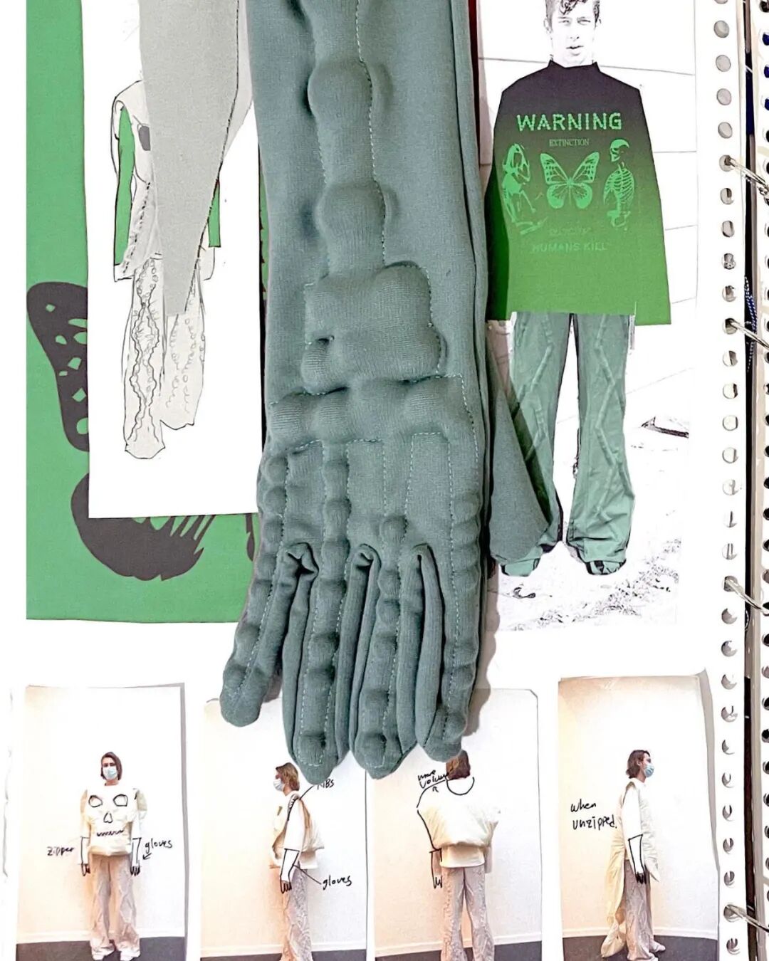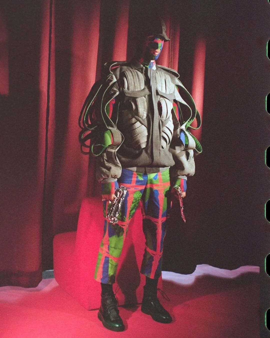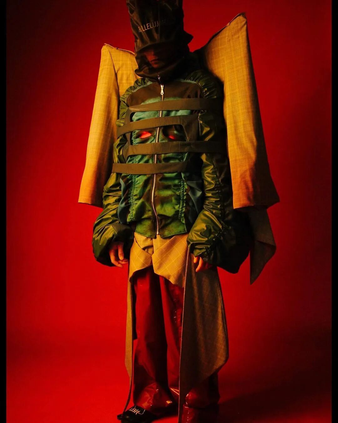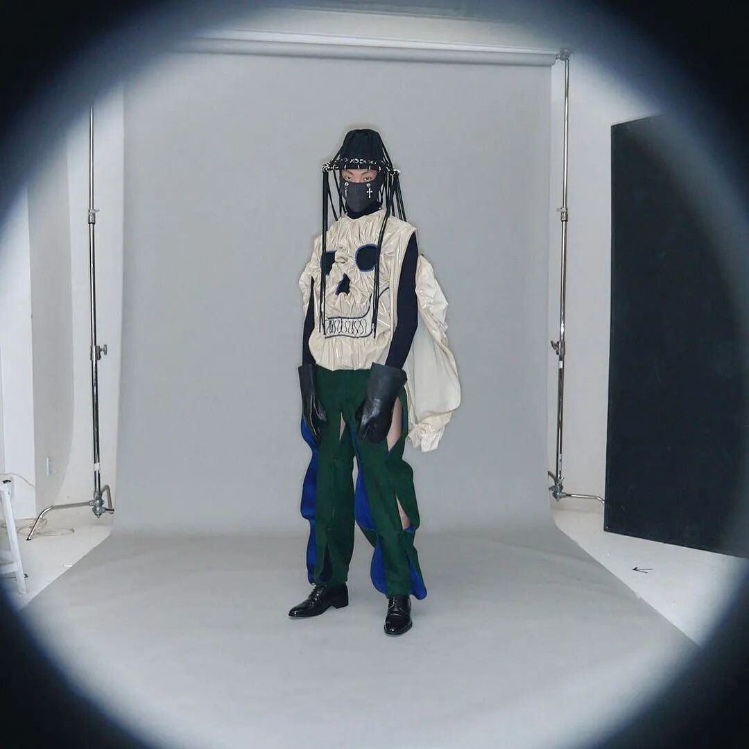 “我开始我的系列时,想到了我们生活在一个破坏性的世界。每当我们打开新闻,就发现一些坏事情正在发生:全球变暖,乌克兰的战争等等。我只是想说,如果我们继续这样生活下去,有一天我们会灭绝。”为了把这一点融入服装,他使用了一些破坏性的洞和骷髅的想法和图像,编入服装后,他将这些意象与他自己的朋克美学相混合,以提高人们的认识。