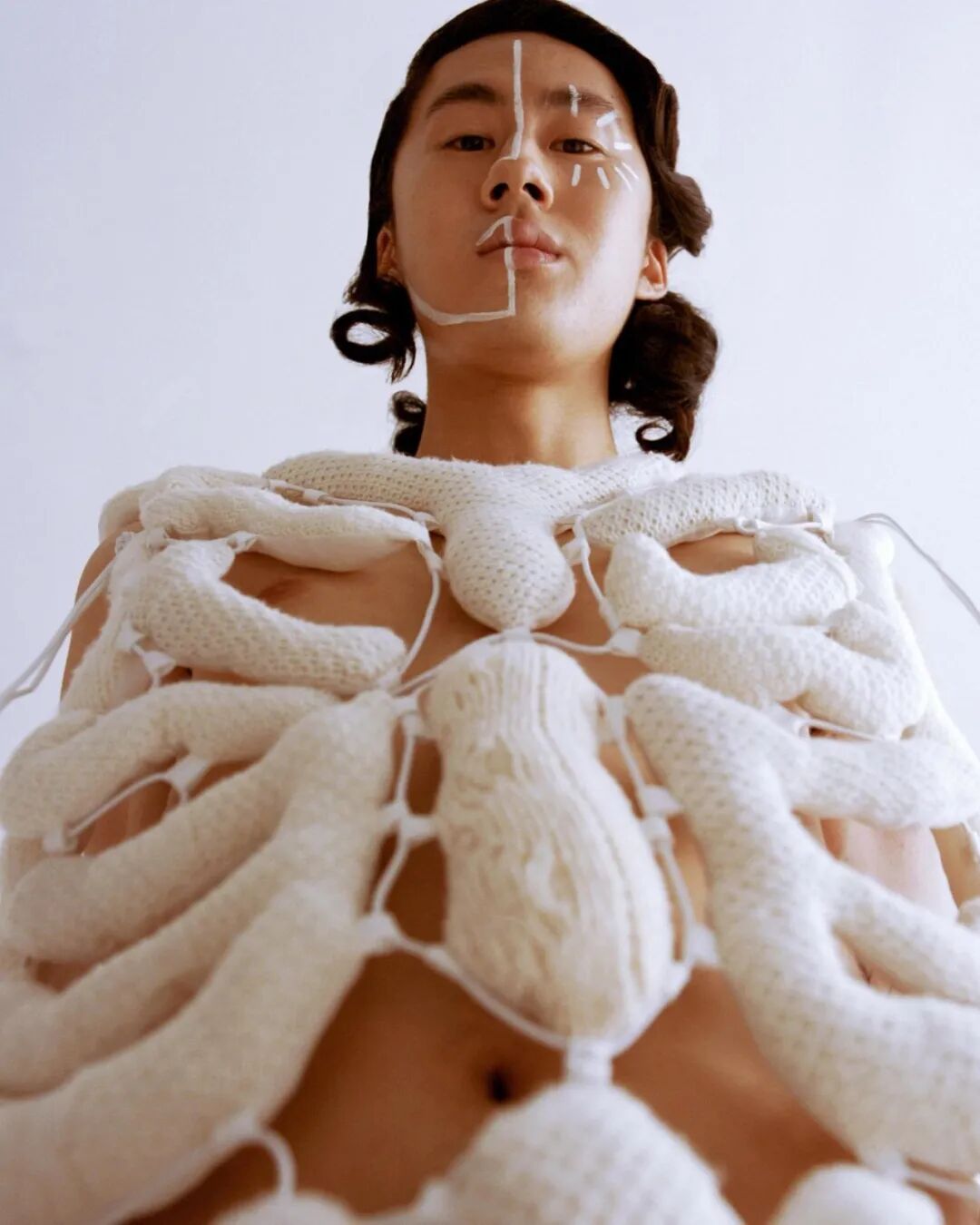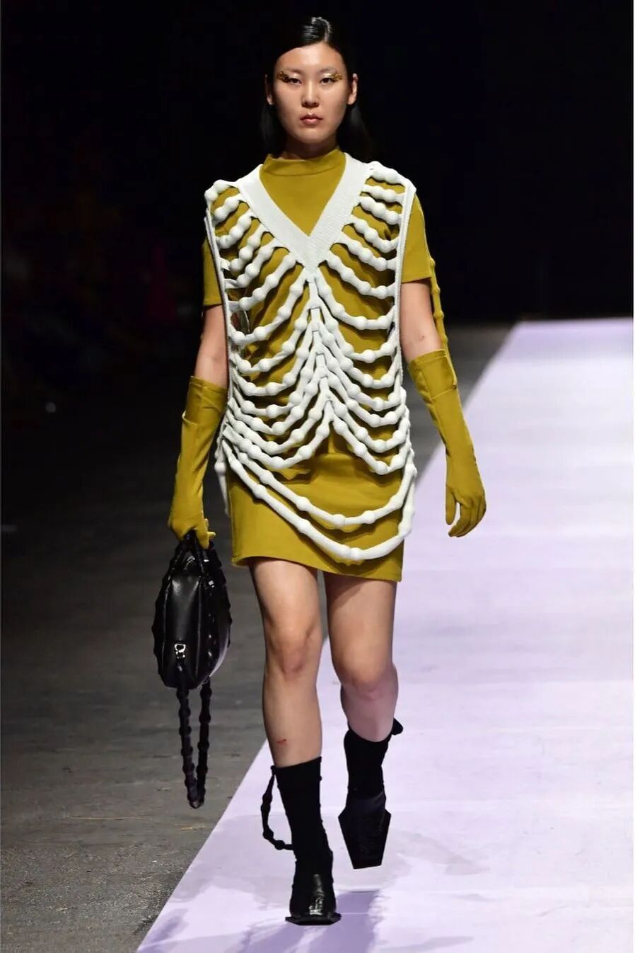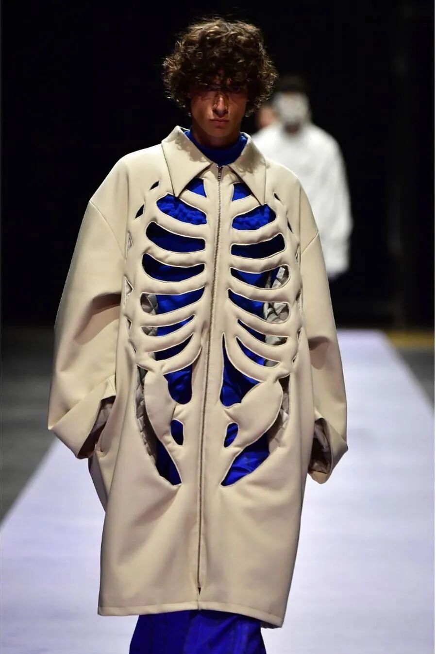 Yeongho Ko说,“我的灵感来自于灾难和灭绝的破坏性图像,如天坑、骷髅和化石。我把这些图像与朋克混合起来,转化为服装。”