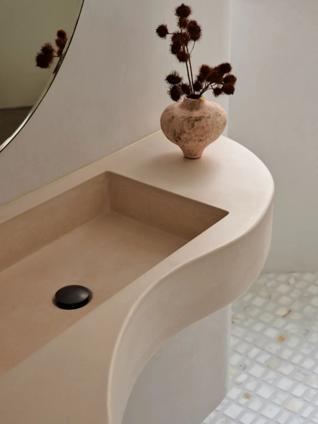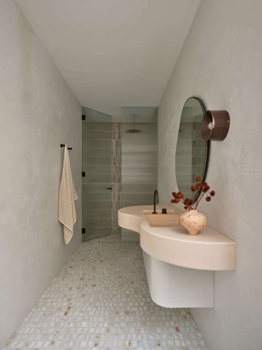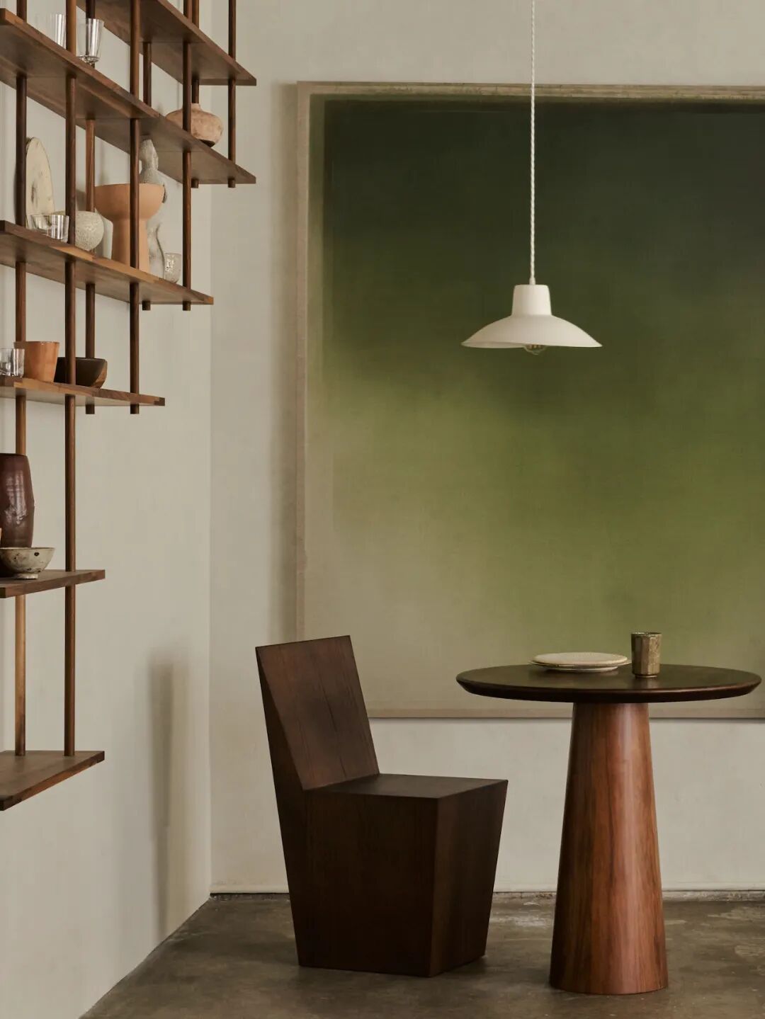 The spaces are conceived as an artist's studio; a gallery of bold, handcrafted shapes that coordinate with one another. Replicating the gallery experience, occupants engage in a two-way dialogue with the inanimate environment; materials, furniture, and art are all there to tell a story. For this reason, natural light is key and "blank space" is cherished. "The interior feels sparse on purpose to draw attention to its contents.