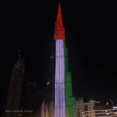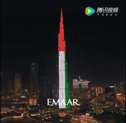 在这样喜庆又浓重的日子里,怎么能少得了哈利法塔的身影呢?它自然发挥了828米高的优势,呈现出精彩的灯光秀。自上而下的投影出阿联酋国旗的颜色红、绿,白,与夜空的黑,一起组成了泛阿拉伯颜色红、绿、白、黑四色。此刻,灯光秀将大家凝聚在一起,仰望哈利法塔,欢度佳节。