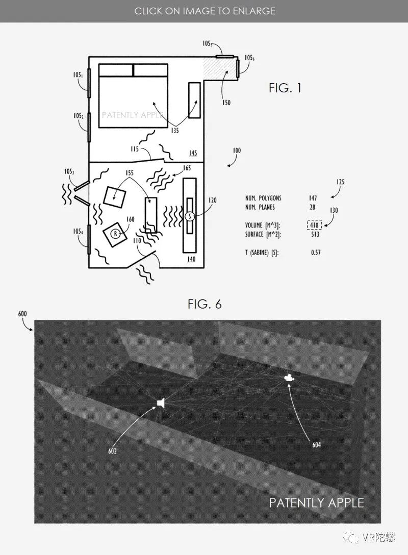 苹果公司的专利图1说明了一个示范性的声学房间模型的相应规范;图6是一个虚拟3D环境的房间声学的示范性可视化。