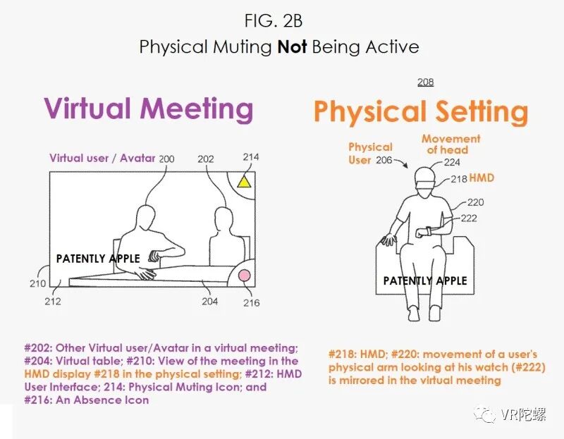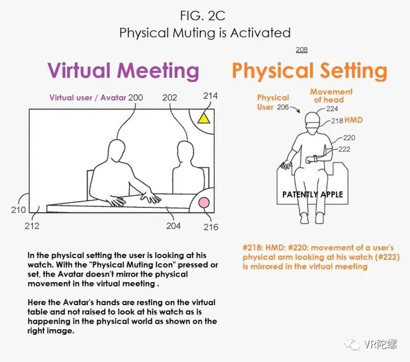 有的时候在虚拟会议中交谈时,如果用户想用他们的手和胳膊展示富有表现力的手势,可以点击打开一个" Absence "图标(缺席模式)。当用户不想以任何方式表达自己时,可以打开HMD界面上的" Physical Muting "图标(物理静音模式)。这些例子在下面的专利图2B和2C中有所介绍。