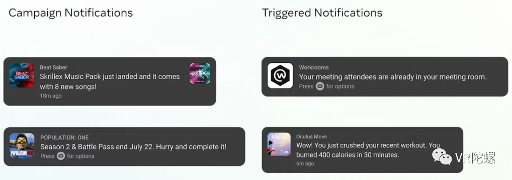 通知将在VR中推送,也将出现在Oculus移动应用的"警告"选项中。此外,Meta表示,机器学习算法将根据用户最常使用的应用程序中向手机推送少量"相关"通知。