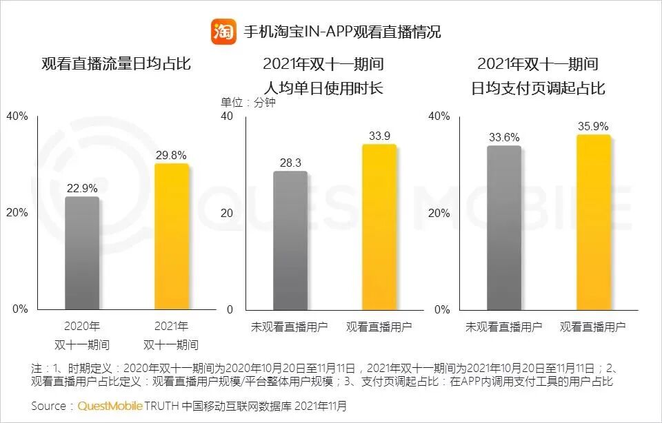 QuestMobile去年曾详细分析了手淘直播所带来的变化,无论是流量类型还是停留时长都已达到相当可观的地步,而且直播确实激发了用户支付页调起的增长。