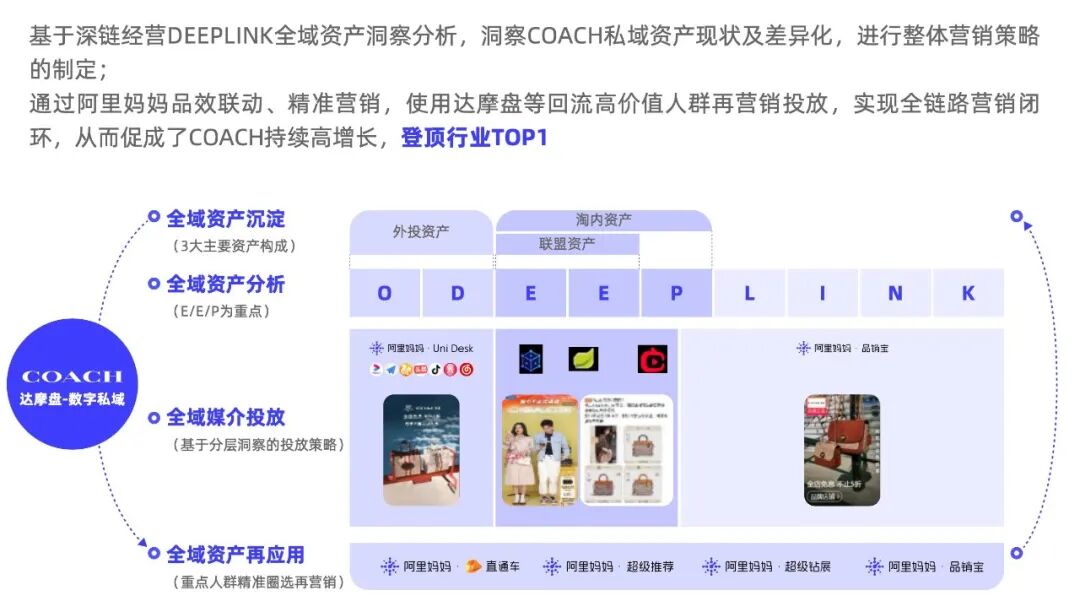 以轻奢品牌COACH为例,达摩盘基于深链经营DEEPLINK全域资产洞察分析,洞察COACH私域资产现状及差异化,为其制定了站外爆品&折扣吸引点击——淘内直播&内容互动引导流转——精准人群转化的整体营销策略,通过阿里妈妈品效联动、精准营销,使用达摩盘等回流高价值人群再营销投放,实现全链路营销闭环,从而促成了COACH持续高增长……由此可见,达摩盘“数字私域“的能力是全域的,不止推动品牌在淘内的销售增长,还能帮品牌扩大全局生意机会。