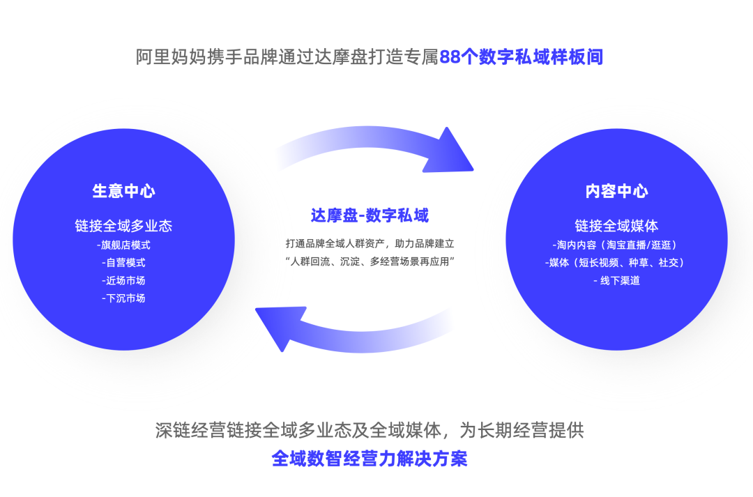 为什么要把数字私域建立在阿里妈妈、在达摩盘?家洛强调,用户的交易过程最终还是会回到天猫和淘宝,因为购物效率、客户关系、很多保障都是在阿里生态内。阿里在电商领域深耕多年,对于线上数智经营的深度理解,早已转变成了服务客户的能力和数智化经营能力。