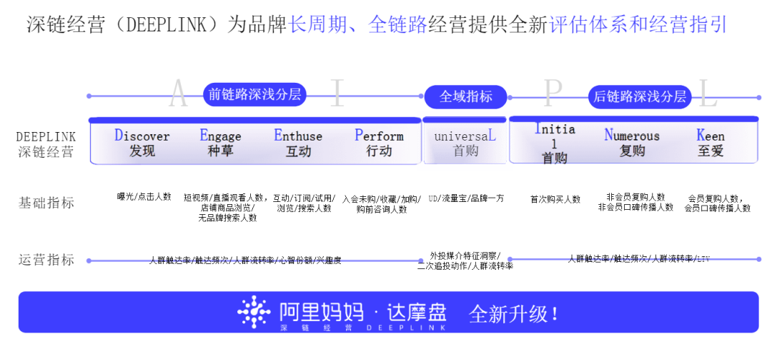作为阿里妈妈生态内帮助品牌构建“数字私域“的产品——达摩盘,阿里妈妈为其定义,品牌在未来经营中,阿里妈妈达摩盘工具不仅是底层逻辑,还能像数智经营领域的CPU一样,切实地为品牌带来全域经营力提升。深链经营DEEPLINK理论作为阿里妈妈全新数智化商业战略的核心方法论,赋予了达摩盘强大的底层支撑。