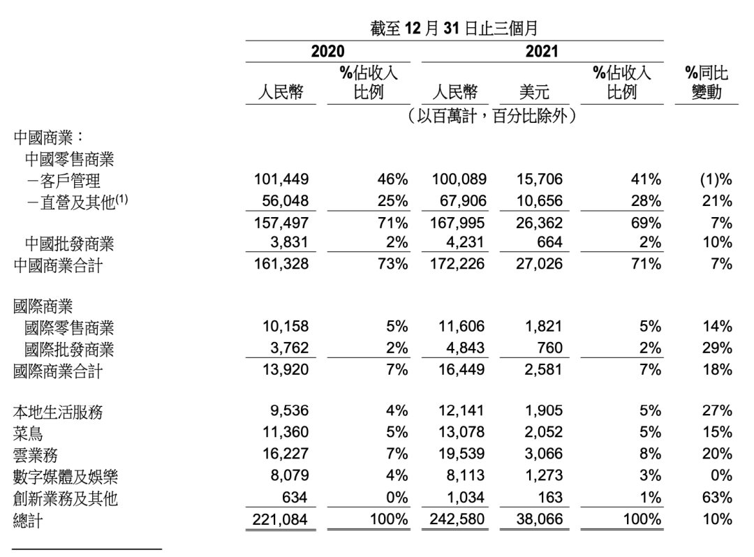 整体上看,零售业务之外,本地生活服务增长尚佳,同比增长27%,云服务业务同比增长20%,相比此前的增速,已经放缓。这其中有海外客户的影响。