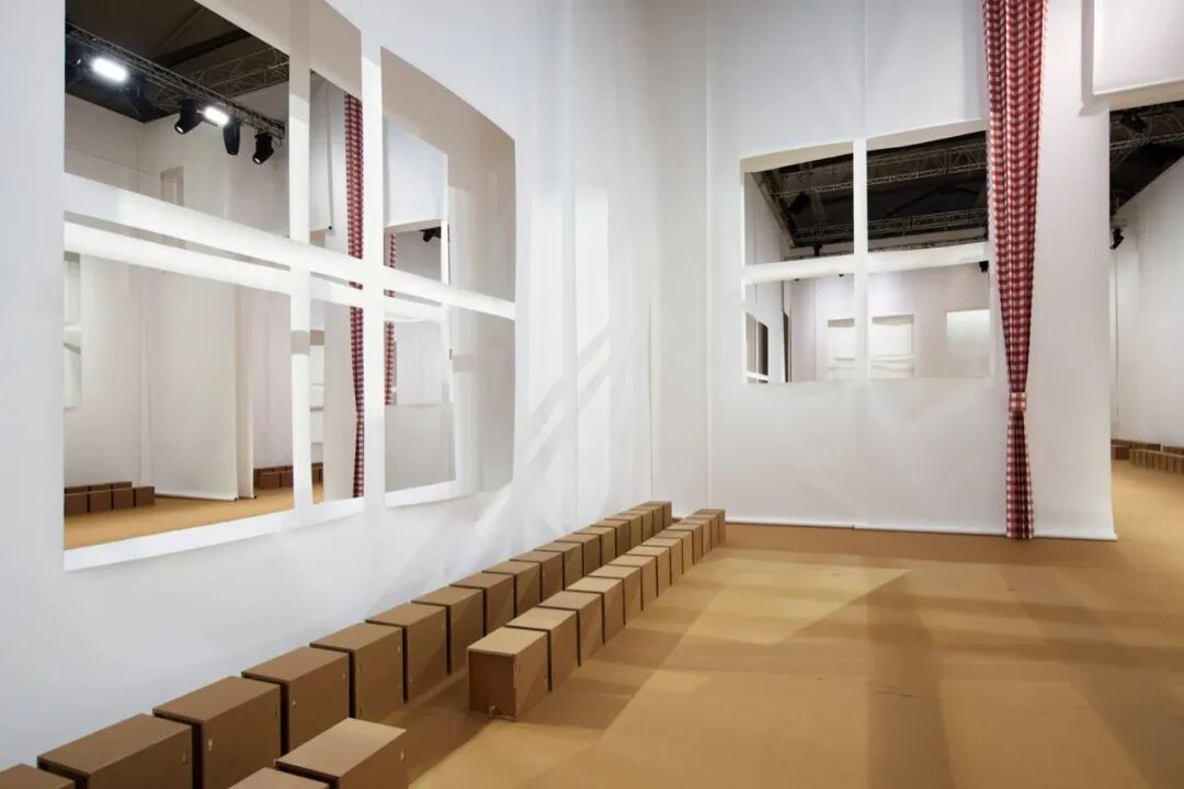 观众们坐在沿着纸房的墙壁两排的立方体椅子上,椅子完全由瓦楞纸板制成。