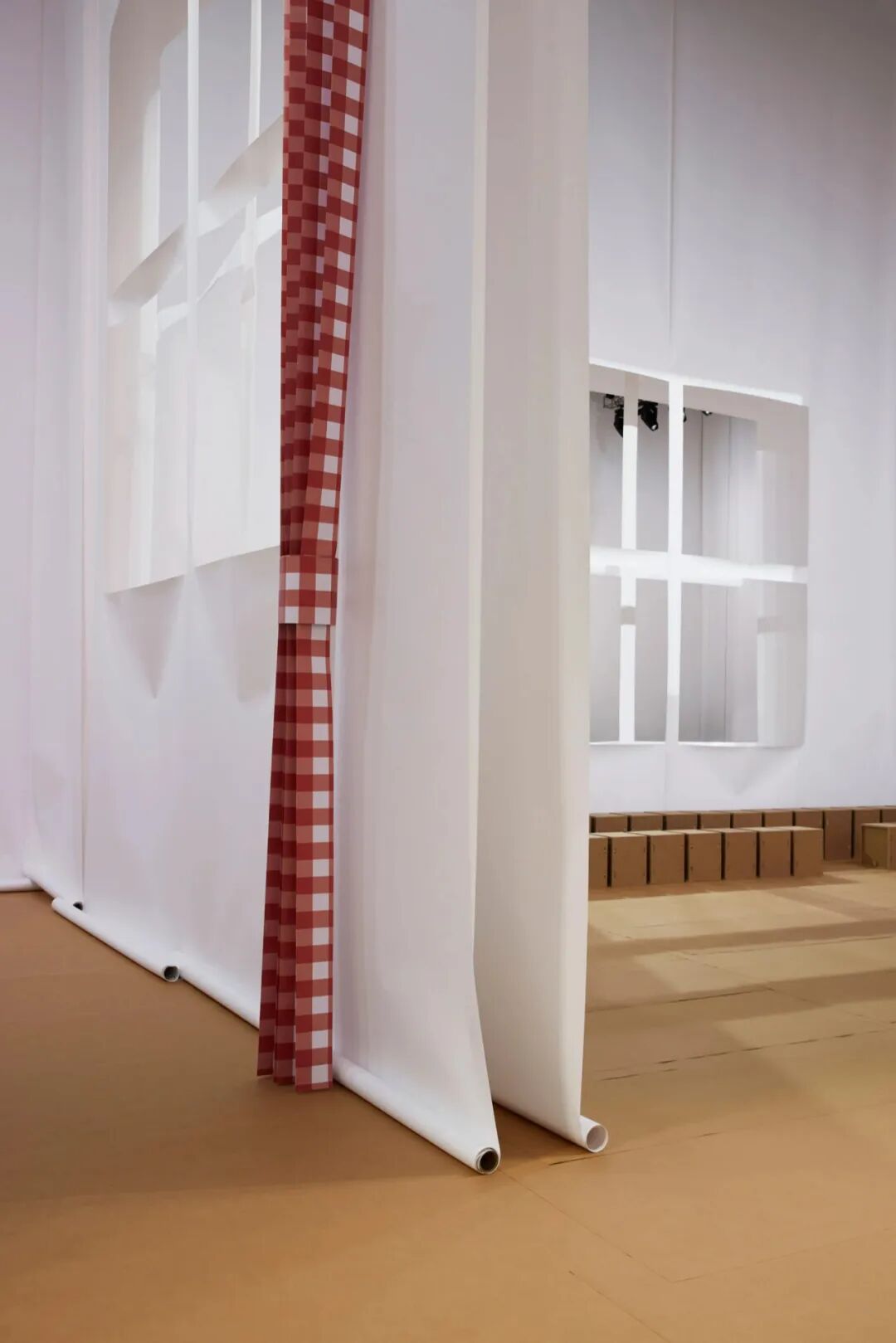 红白相间的印花窗帘从纸墙的顶部一直延伸到地板,并被手风琴折叠,以模仿整齐聚集的织物。