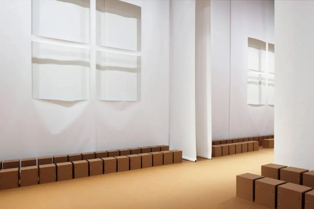 纸卷被组织在不同的高度,以创建通向房间的超大门口,其原始边缘固定在跨越 Fondazione Prada 天花板的金属桁架系统。