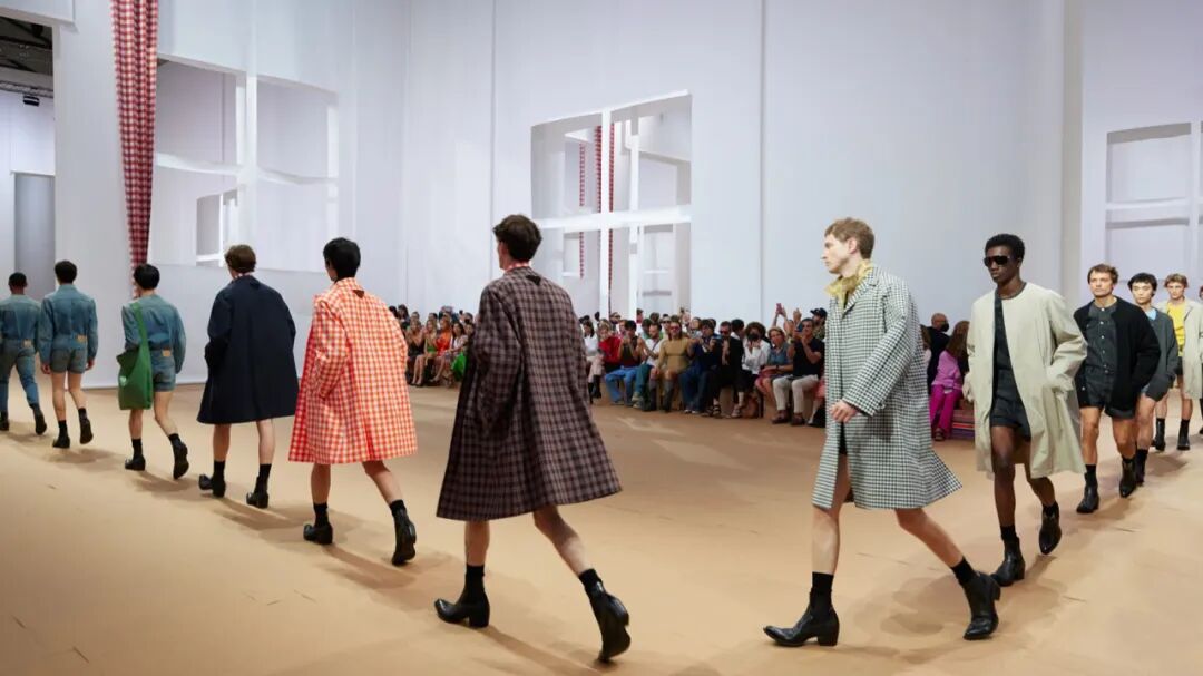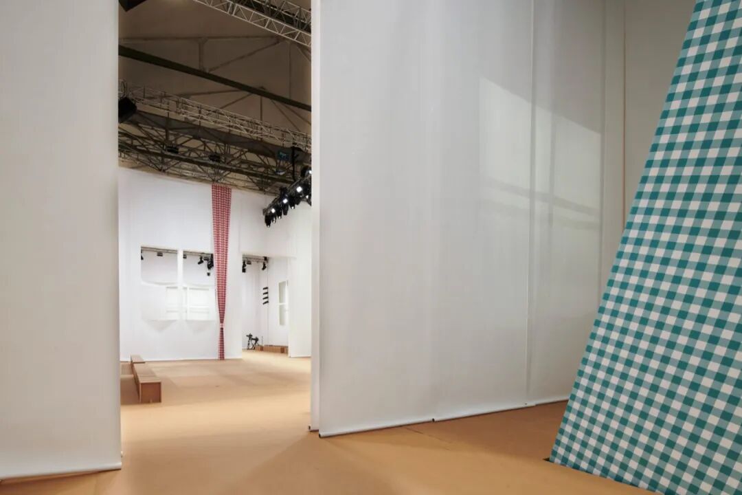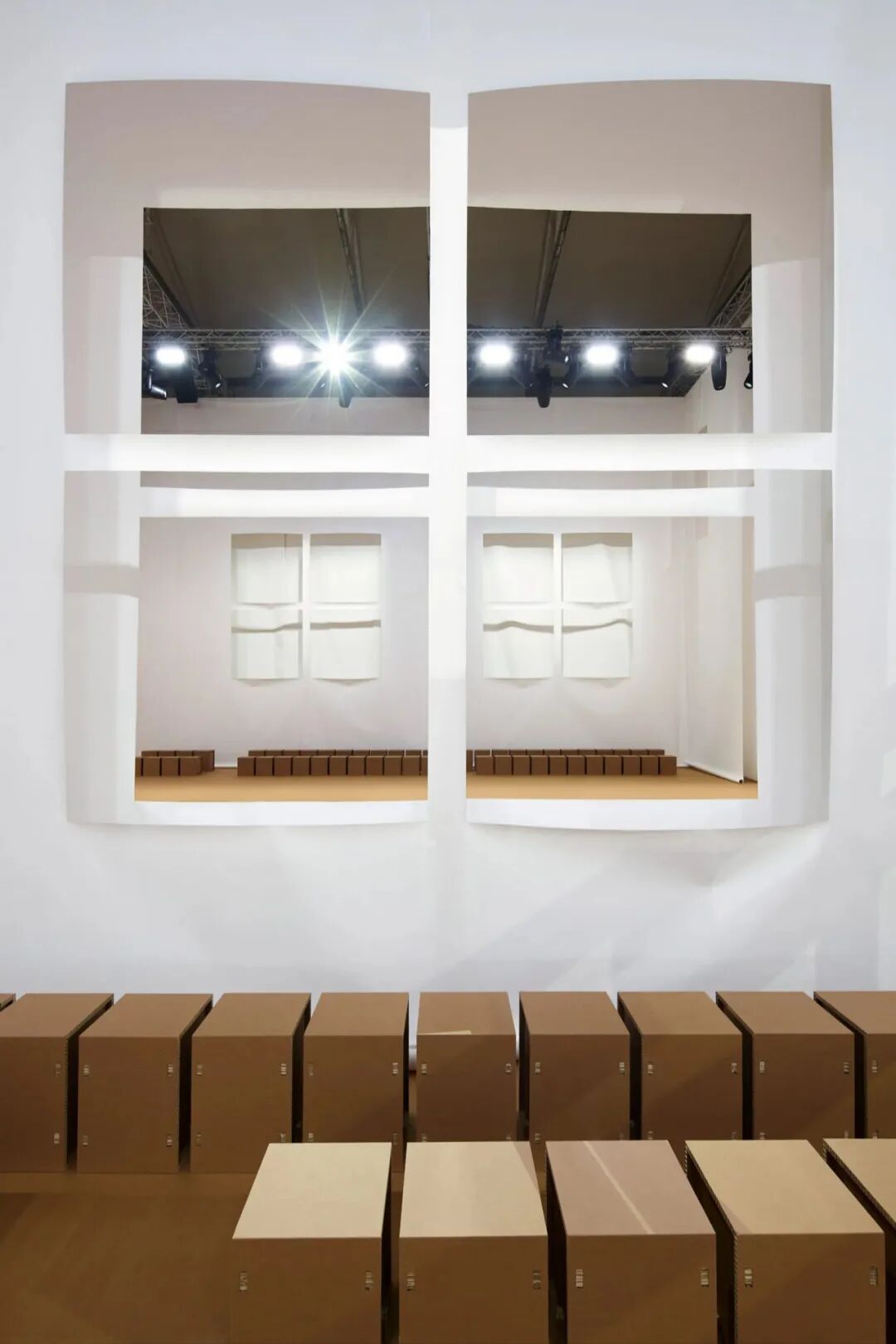 这场秀在米兰的 Fondazione Prada 举办,荷兰建筑事务所 OMA 的研究工作室 AMO 将这个空间变成了一个超大的家,墙壁、窗户、地板和窗帘都是由厚重的毛边纸卷制成的。